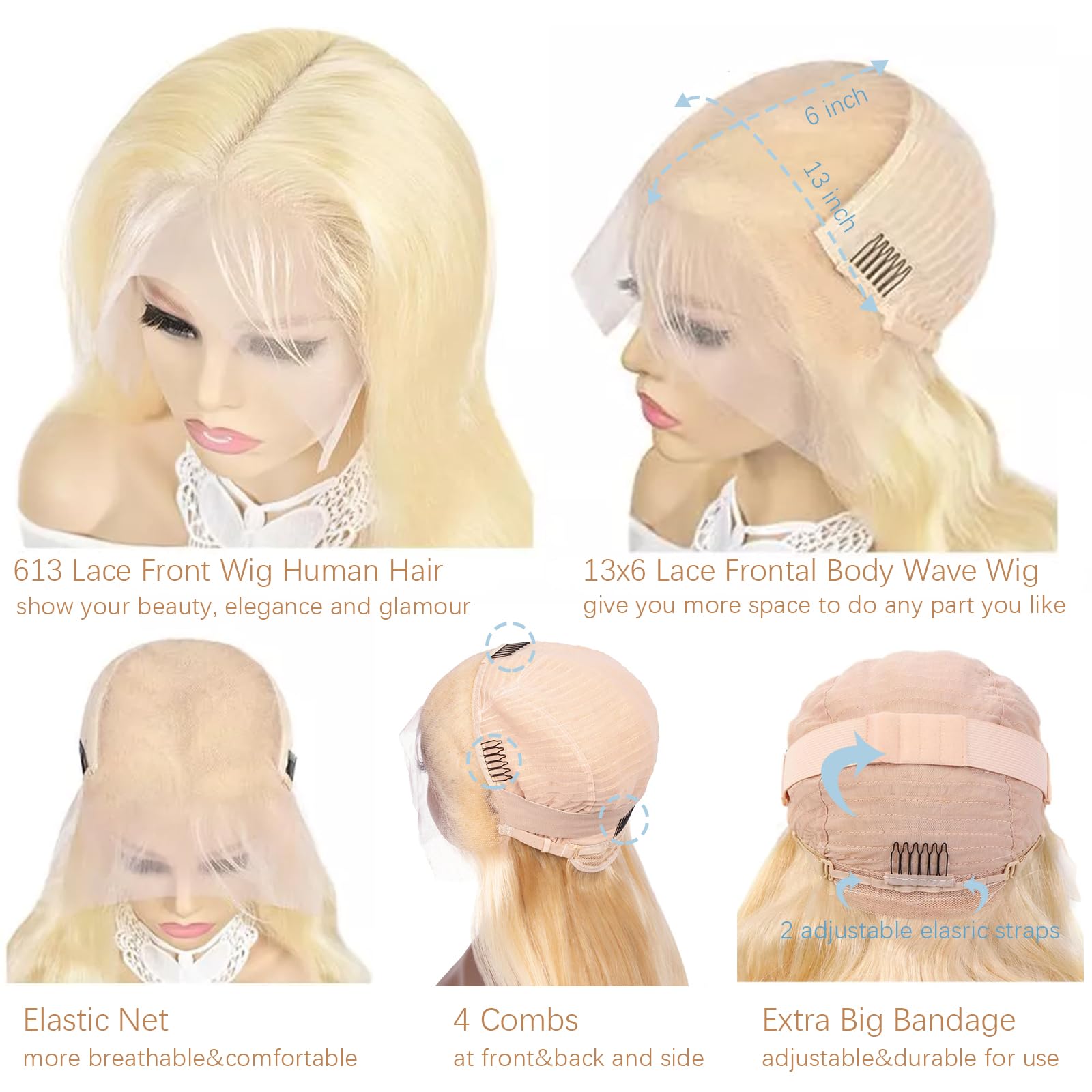 - 【613 Human Hair Wig Detail】: 613 13x6 lace front wigs human hair wig cap is average size 22.5 Inch, with 3 adjustable straps(2 small & a big) and 4 combs, durable & easy to adjust, suitable for almost customers. Blonde wig human hair pre plucked with baby hair.