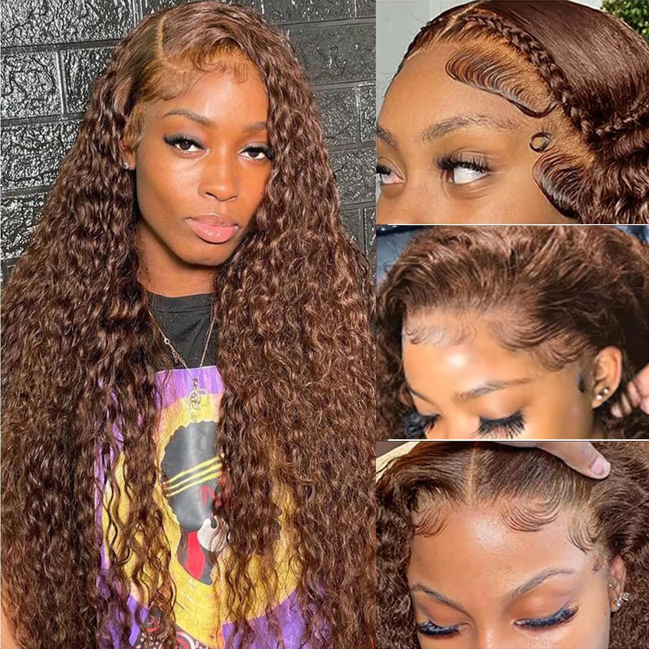 30 Inch Chocolate Brown Deep Wave Lace Front Wigs Human Hair 13x6 Hd Curly Lace Frontal Wigs for Black Women Pre Plucked Wet and Wavy Glueless 4# Brown Color