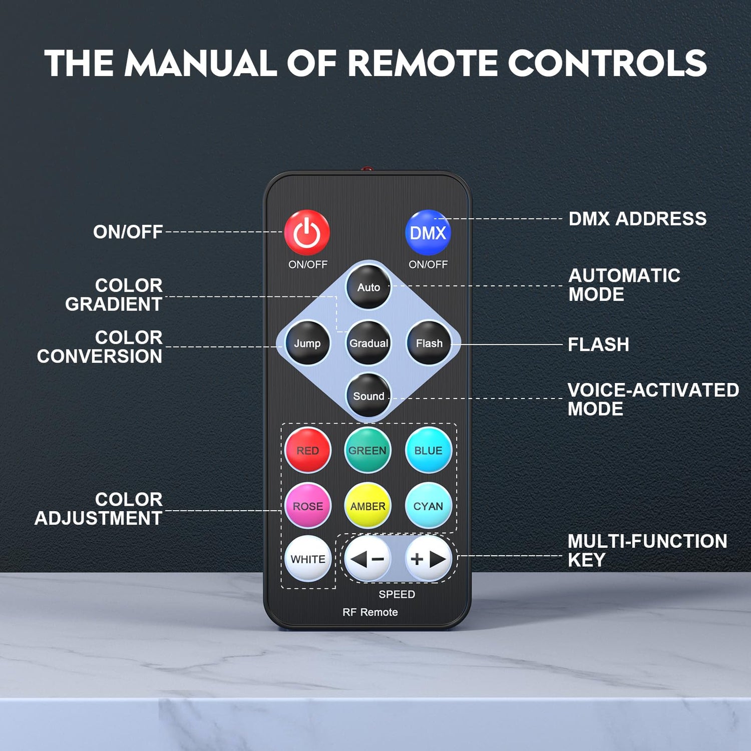 - Convenient Control: Easily adjust the lighting modes and settings using the included controller, allowing for seamless operation from a distance. Alternatively, connect to a DMX console for precise control over professional 7CH channel modes.