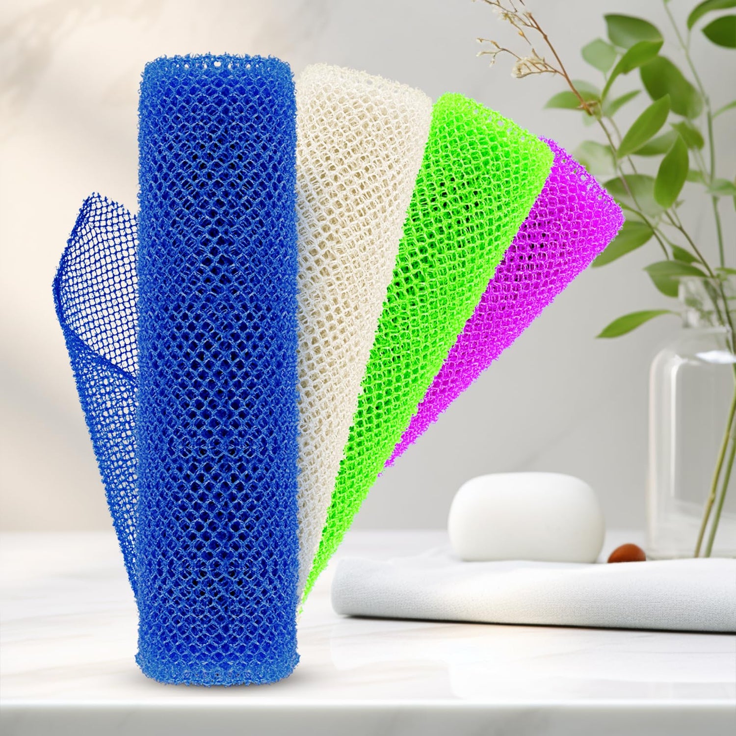 4 Pieces African Net Sponge – Effective Deep Cleansing and Exfoliating Mesh for Glowing Skin – Stretchable, Quick-Dry Exfoliating Bath Sponge(Blue, Green, Purple, White)