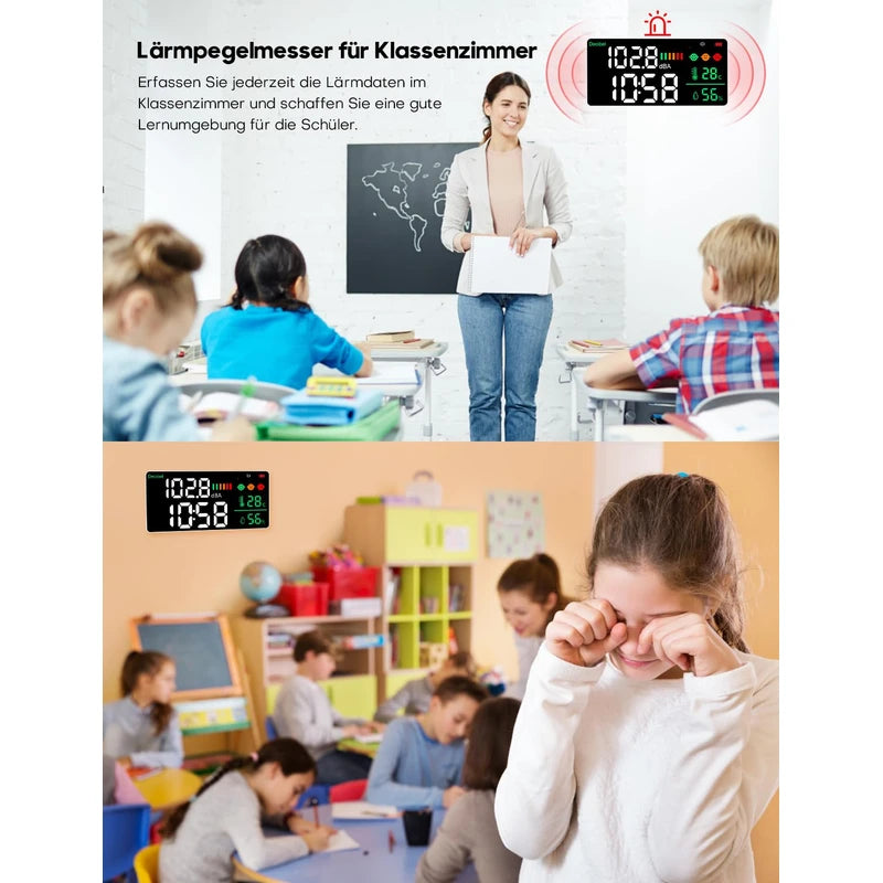 - 5-in-1 multifunctional with large 11 inch LED display: this decibel meter has a large 11 inch LED display with adjustable brightness. It combines the functions of a sound level meter, temperature meter, humidity meter, a clock and a noise level indicator, giving you great comfort both at work and in daily life.