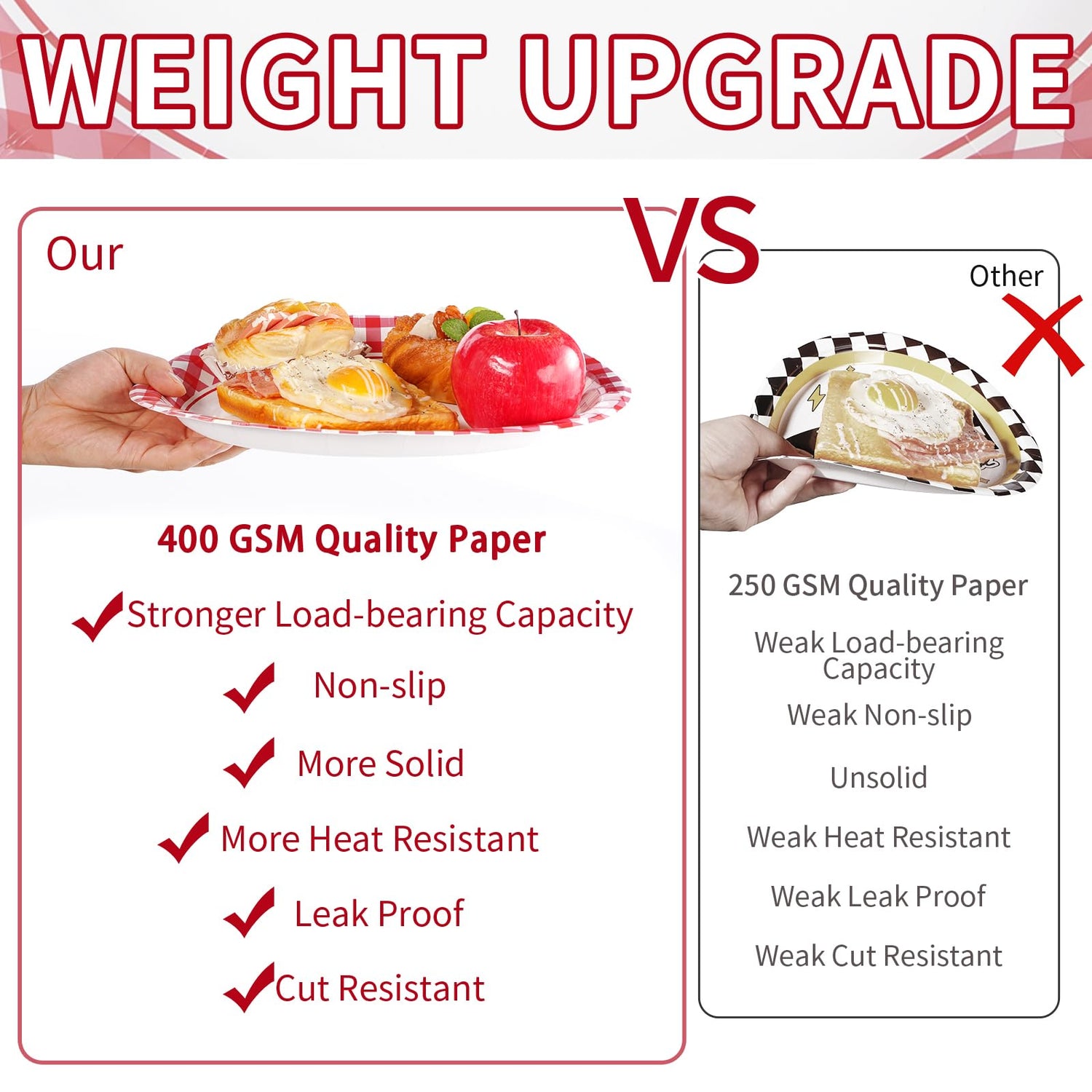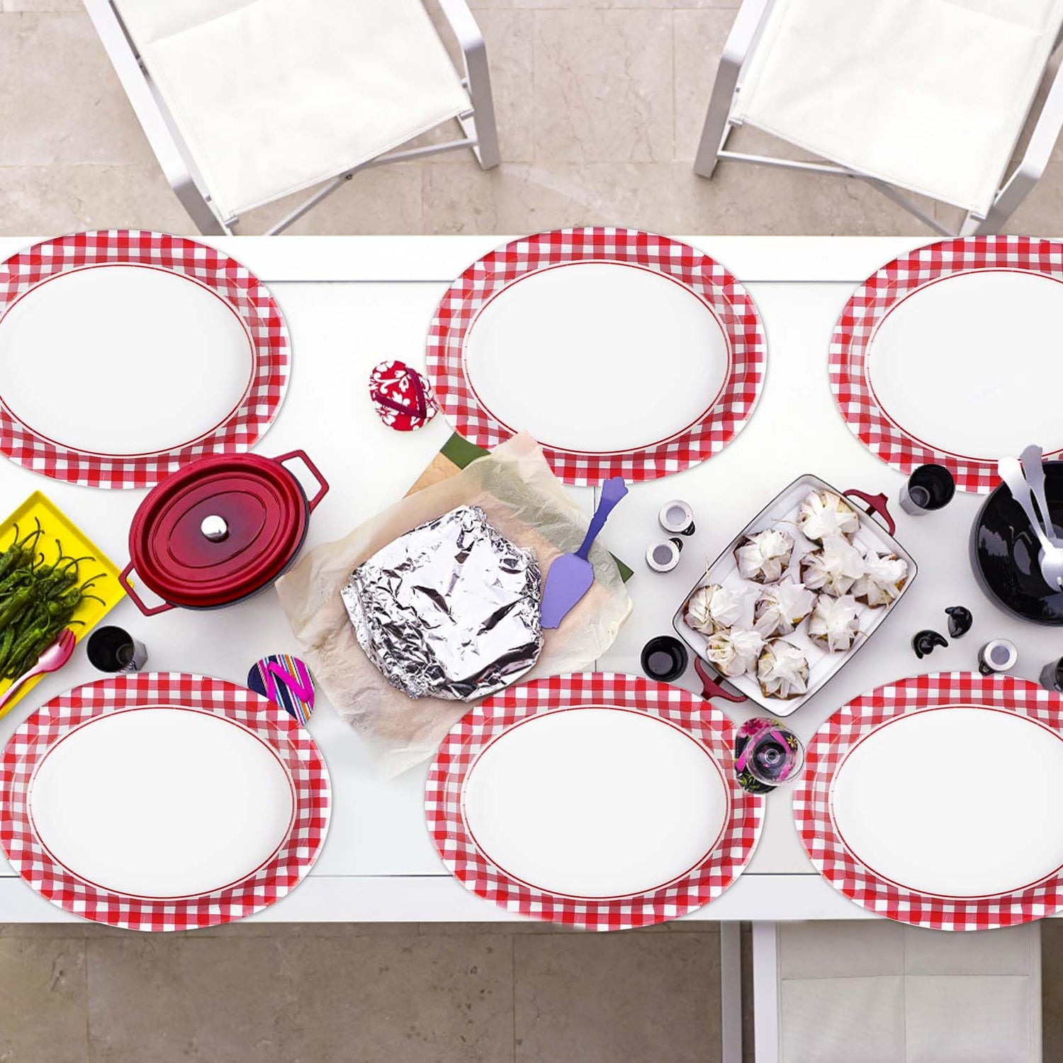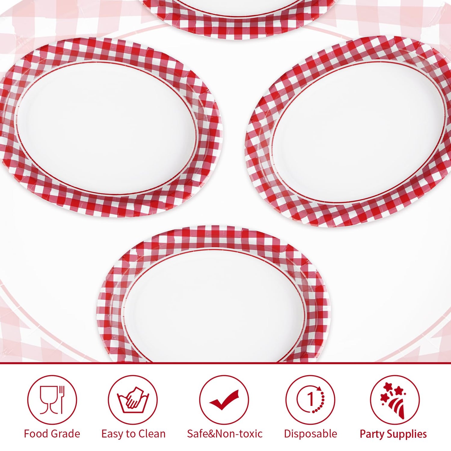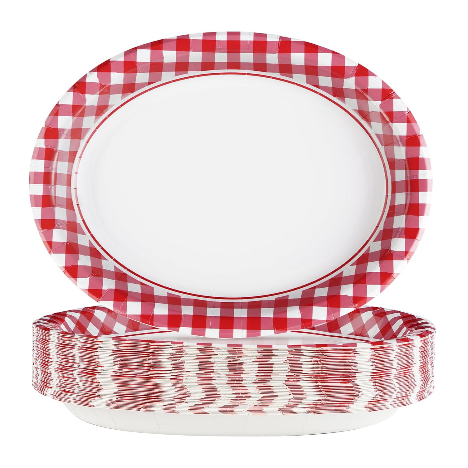 - Large Capacity Set:Package contains 50 pcs picnic red gingham disposable oval paper plates, plenty enough to meet your family use and party needs. The enlarged capacity size is about 10" x 12"/25.4 x 30.5cm, which can hold more food and provide plenty of space for your deplicious treats. They are perfect for serving cakes, snacks and other types of hearty dinners.
