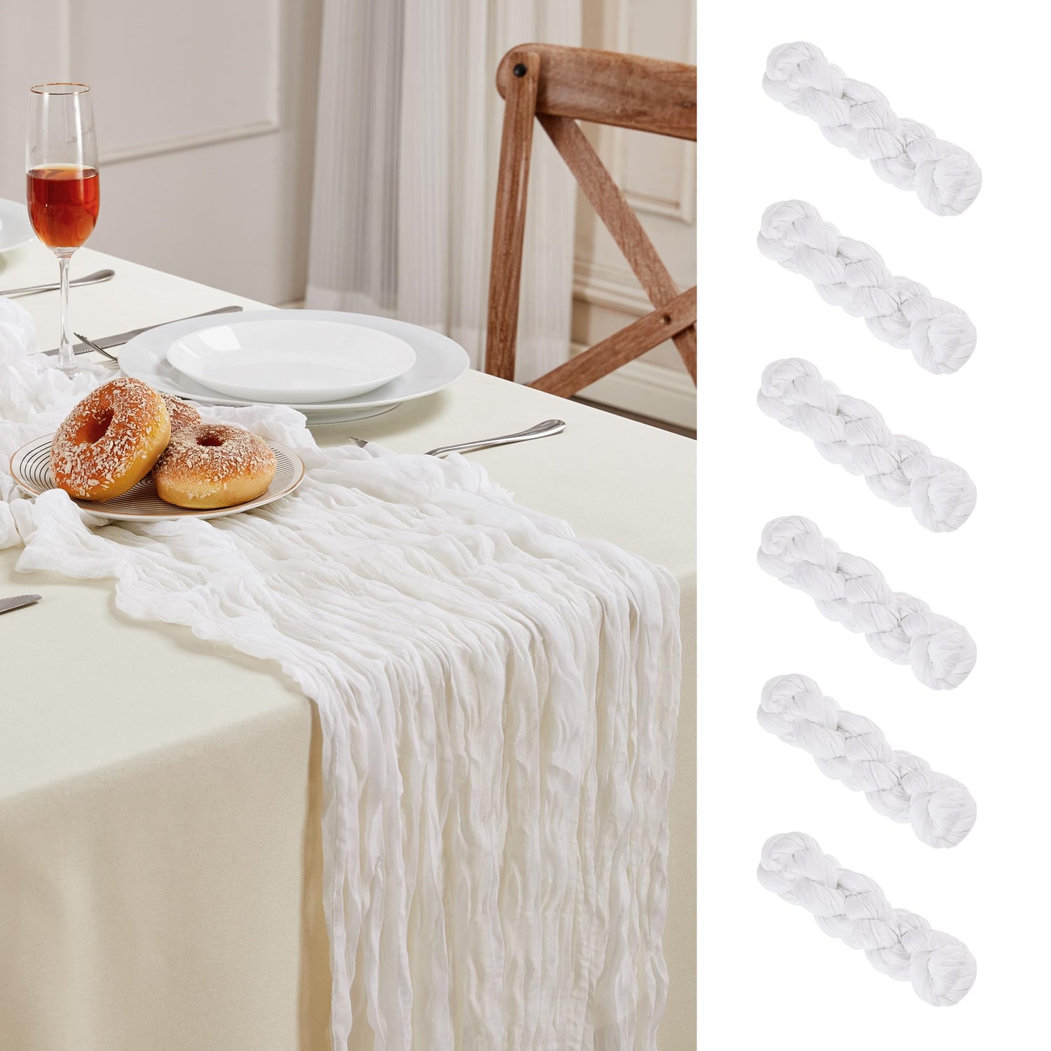 - PACKAGE INCLUDED: You will receive 6 pieces of white cheesecloth table runners. Elegant and beautiful design, exquisite workmanship. Product size: Each boho table runner is 35 x 120 inches. Enough to cover rectangles and round tables, as well as long tables that are stitched together. It can even be used to belt chairs decorate napkins, background curtains. Round or square tables for 8-10 people, perfect for romantic and elegant party events