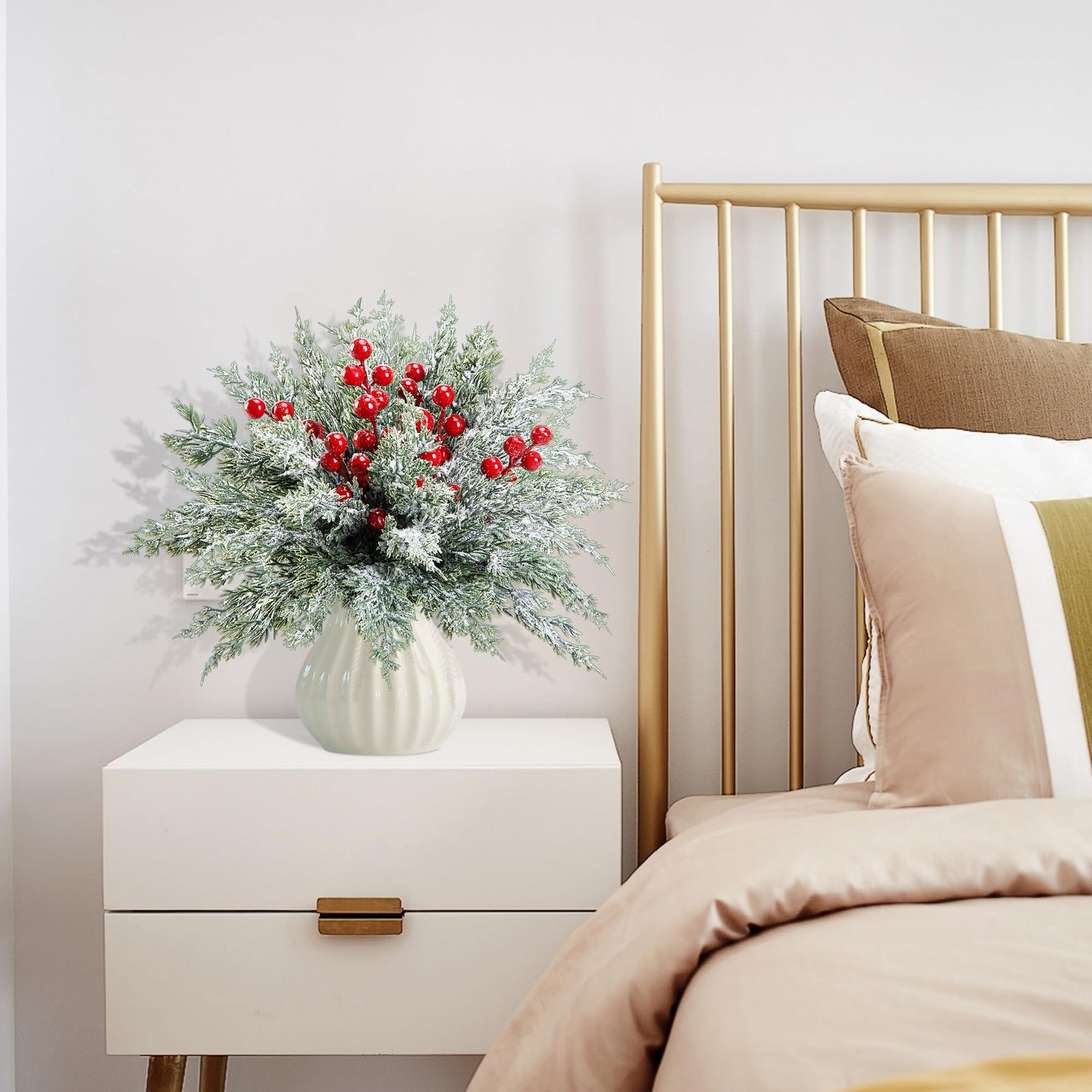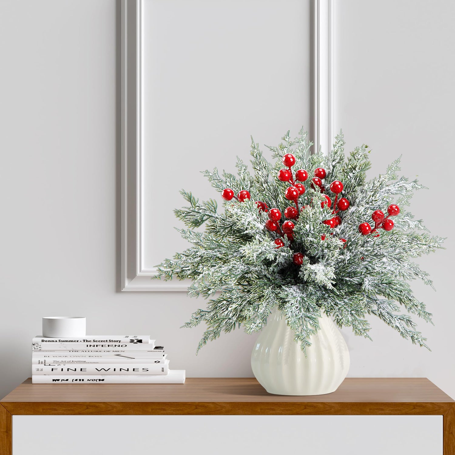- Package Includes: You will receive 45 pcs snow flocked Xmas pine branches measuring 10 inch, and 15 pcs artificial red berries stems measuring 7 inch, which is easy to insert in the vase (Not include vase), perfect for a variety of holiday wreath garden home decor. You can pull it manually to achieve a looser effect.