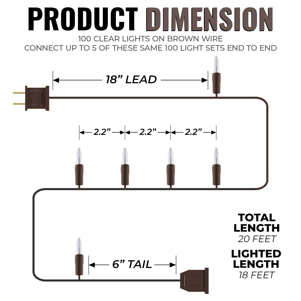 - 18’ of Lighted Length, 20’ of Total Length, 2.2” spacing between bulbs