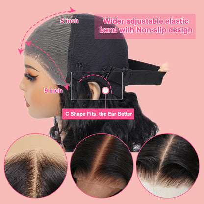 - 4.Glueless Luxury Body Wave Bob Wig:9x5 HD Transparent Swiss Lace, Say Goodbye To The Hassle of Using Glue, Gel, or Spray. No Need to Cut the Lace ,Just Wear to Go! Blends Perfectly Into Your Skin, Soft and Breathable, Can Be Side/Middle Part!