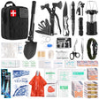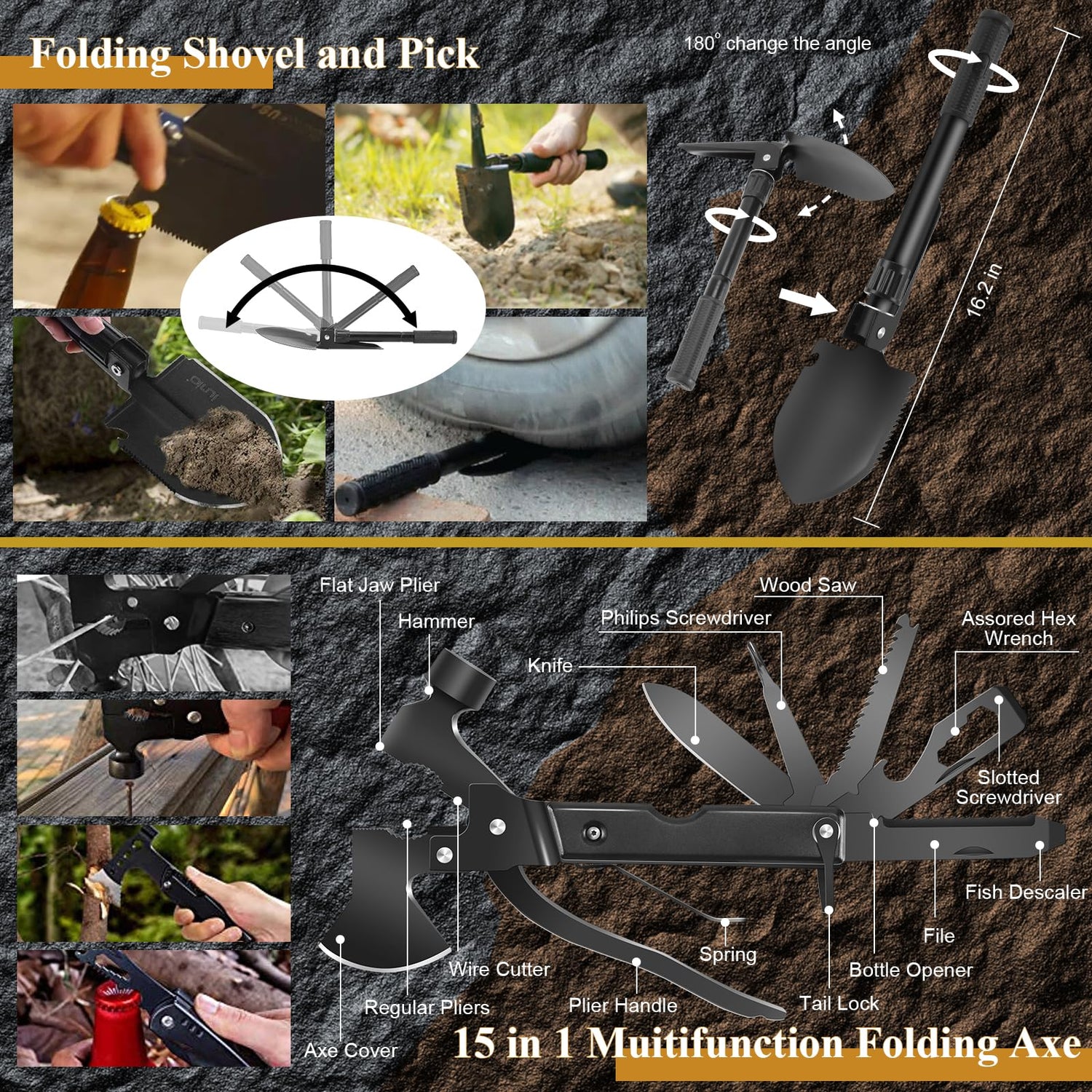- 【High-quality Survival Gear and Equipment for Camping or Home Needs】 The survival first aid kit offers high-quality and professional tactical survival tools to ensure you will be well-prepared under any emergencies. The kit contains: 14 in 1 hatchet, folding shovel and pick, collapsible tent lantern, tactical flashlight, survival bracelet,multi-tool card, fire starter, emergency blanket, 12-hour glow stick, wire saw, and emergency rain poncho.