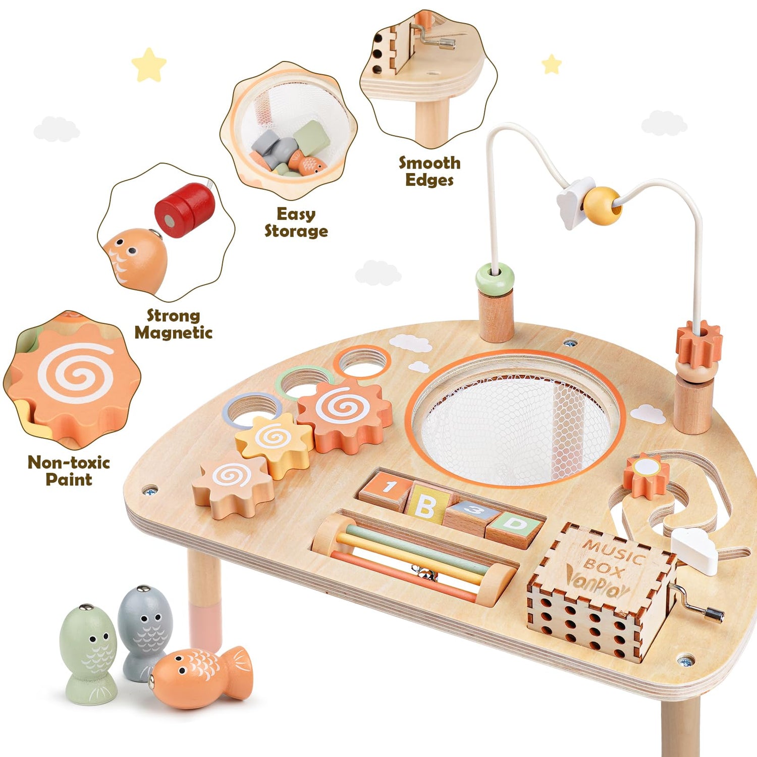 - 【Learning While Playing】Shape sorter & fishing game exercise eye-hand coordination. Bead maze develops problem-solving skills, promoting the development of logical thinking. Music box their sense of hearing and touch by playing. The learning play table is an educational toy with diverse and interesting play options, which is a good partner for toddlers to grow up.