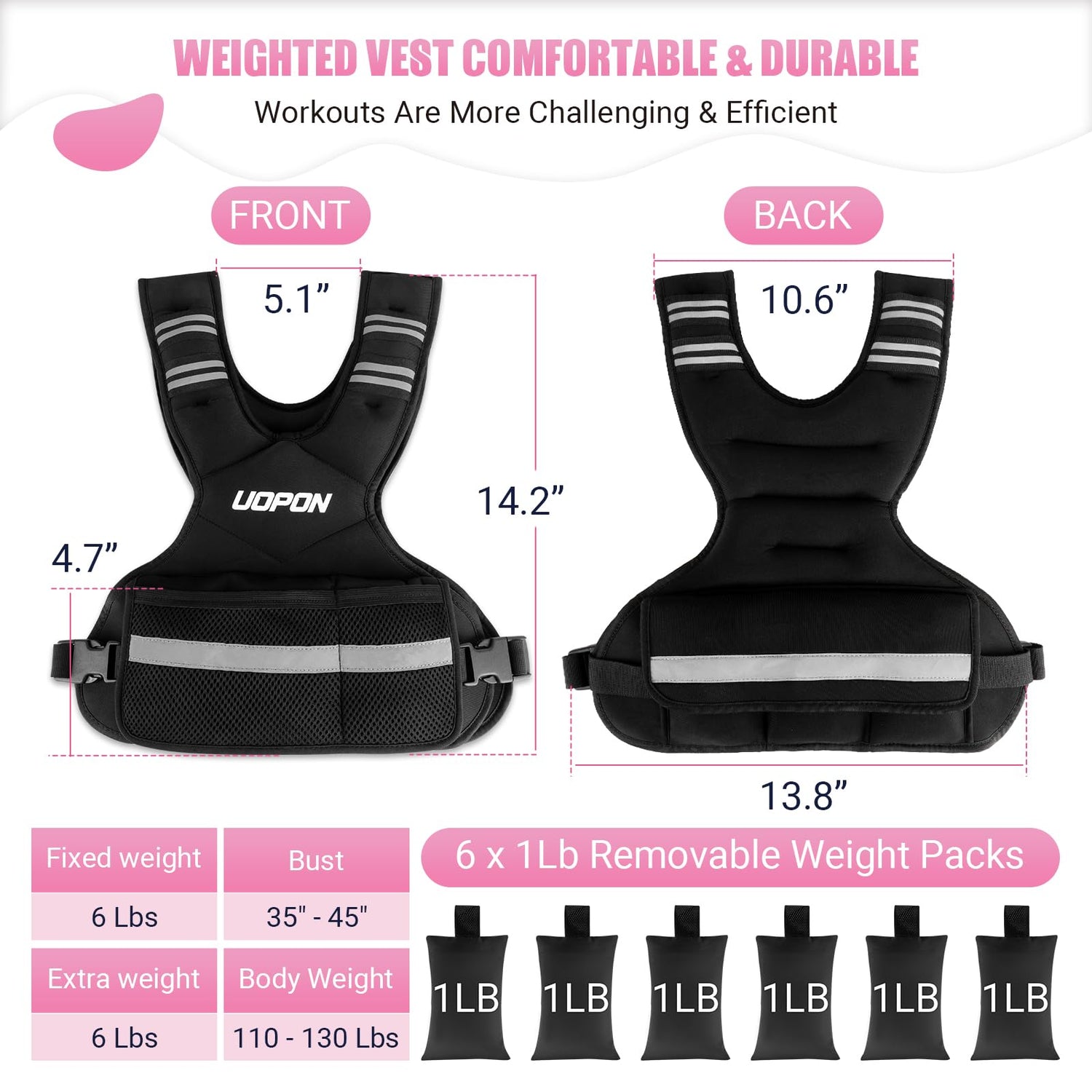 - DURABLE & COMFORTABLE: Our best adjustable weighted vest for women 6 Lbs on its own, adjustable weighted vest with 6*1 lb removable weights packs, it can be adjusted to increase the weight to 12 Lbs. Rucking vest for women is made of lightweight and breathable neoprene with high-quality, soft iron sand filling, designed to provide a comfortable wearing experience. The excellent breathability helps maintain a refreshing feeling during exercise, ensuring comfort and dryness during weight training