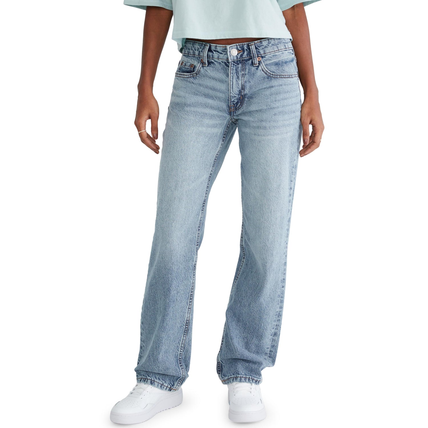 - Medium wash, whiskering and fading, low rise jeans. Easy through the thigh, relaxed straight leg.
