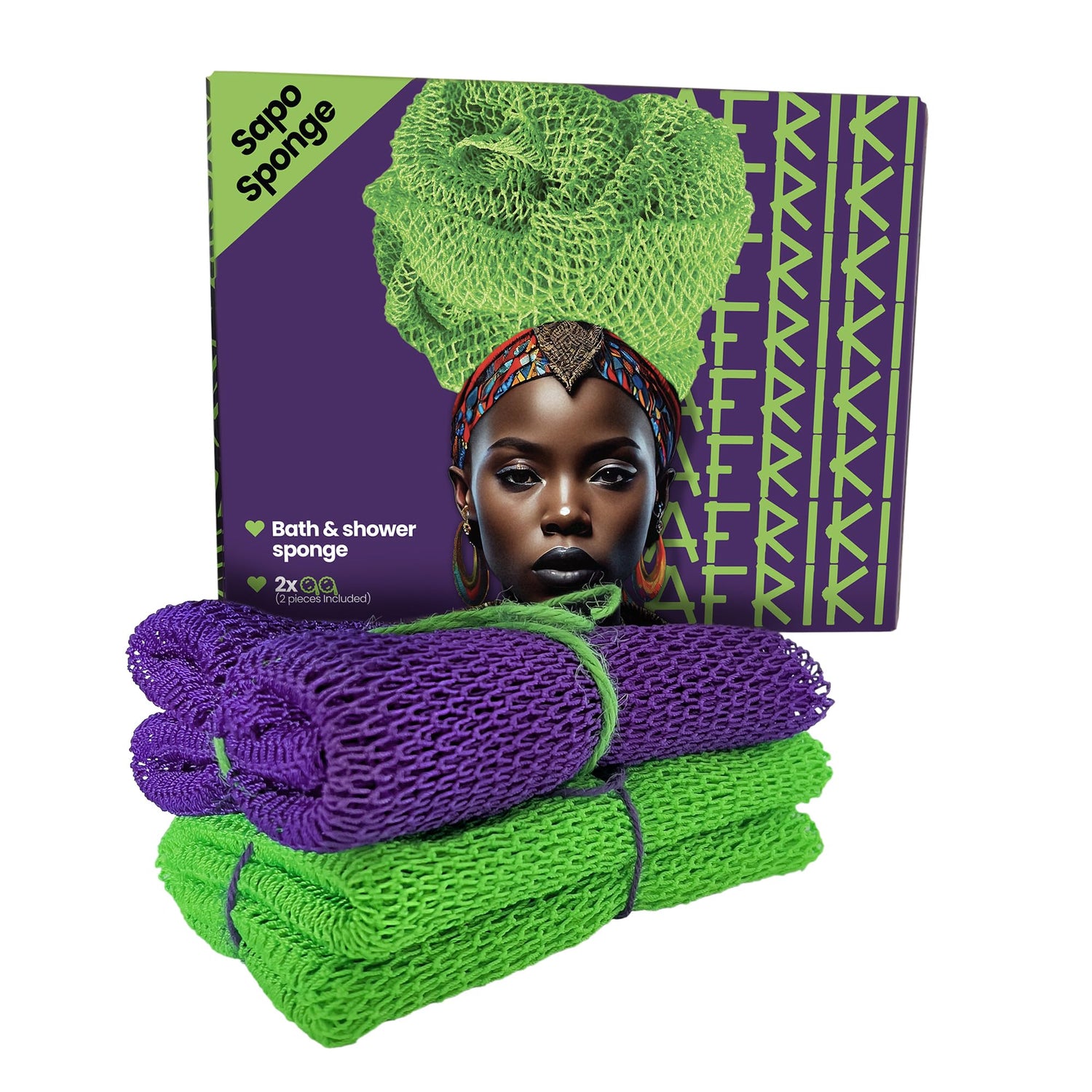 AFRIKI African Net Sponge, African Exfoliating Sponge, Black Owned, Exfoliating Washcloth, Body Exfoliator for Bath and Shower, Back Scrubber, Dead Skin Remover (Green, Purple, 1 Count (Pack of 2))