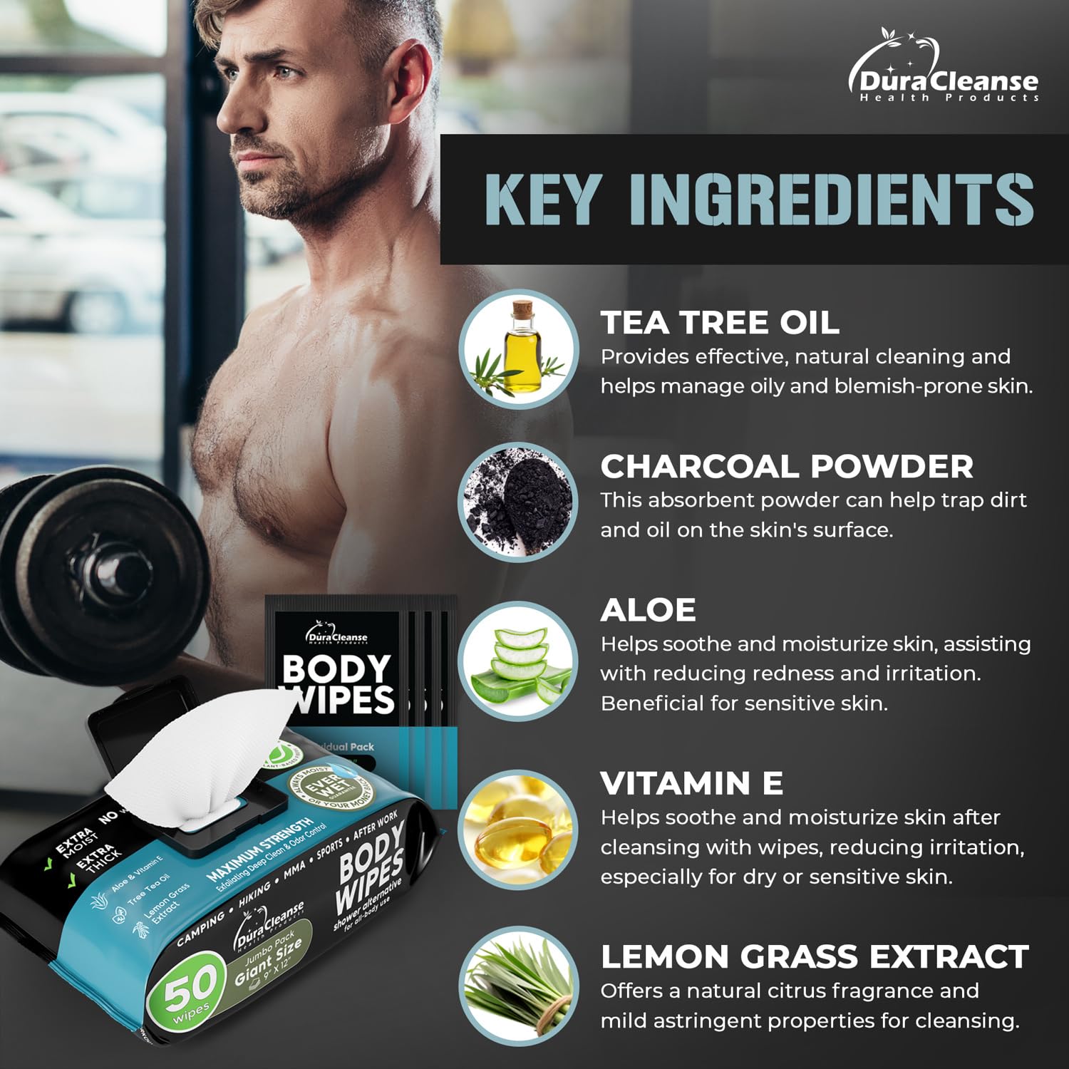 - Fresh & Clean: Our pre-moistened camping essentials for men are scented with tea tree oil, lemon grass, and aloe -free of harsh chemicals and perfumes. Unlike competitors' products, our body wipes for men are hypoallergenic and non-irritating, making the bathing wipes safe for sensitive skin & all body areas. Our no-rinse wipes for men help remove odors with activated charcoal. They are without alcohol or masking fragrances, leaving skin refreshed and clean. Suitable as mens face wipes.