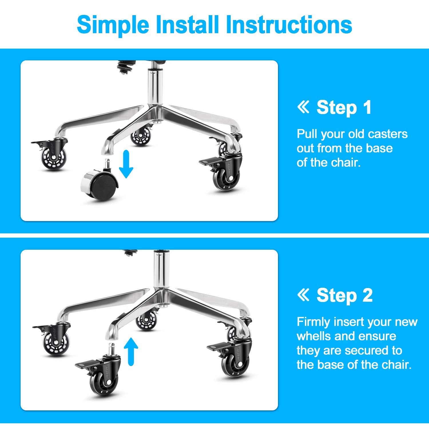 - ♦ Easy Installing with Screwdriver -- Simply pull off your old casters from your office chair. Then firmly insert the new chair casters replacement and make sure they are secured to the chair. The screwdriver that comes with will make the installing much easier.