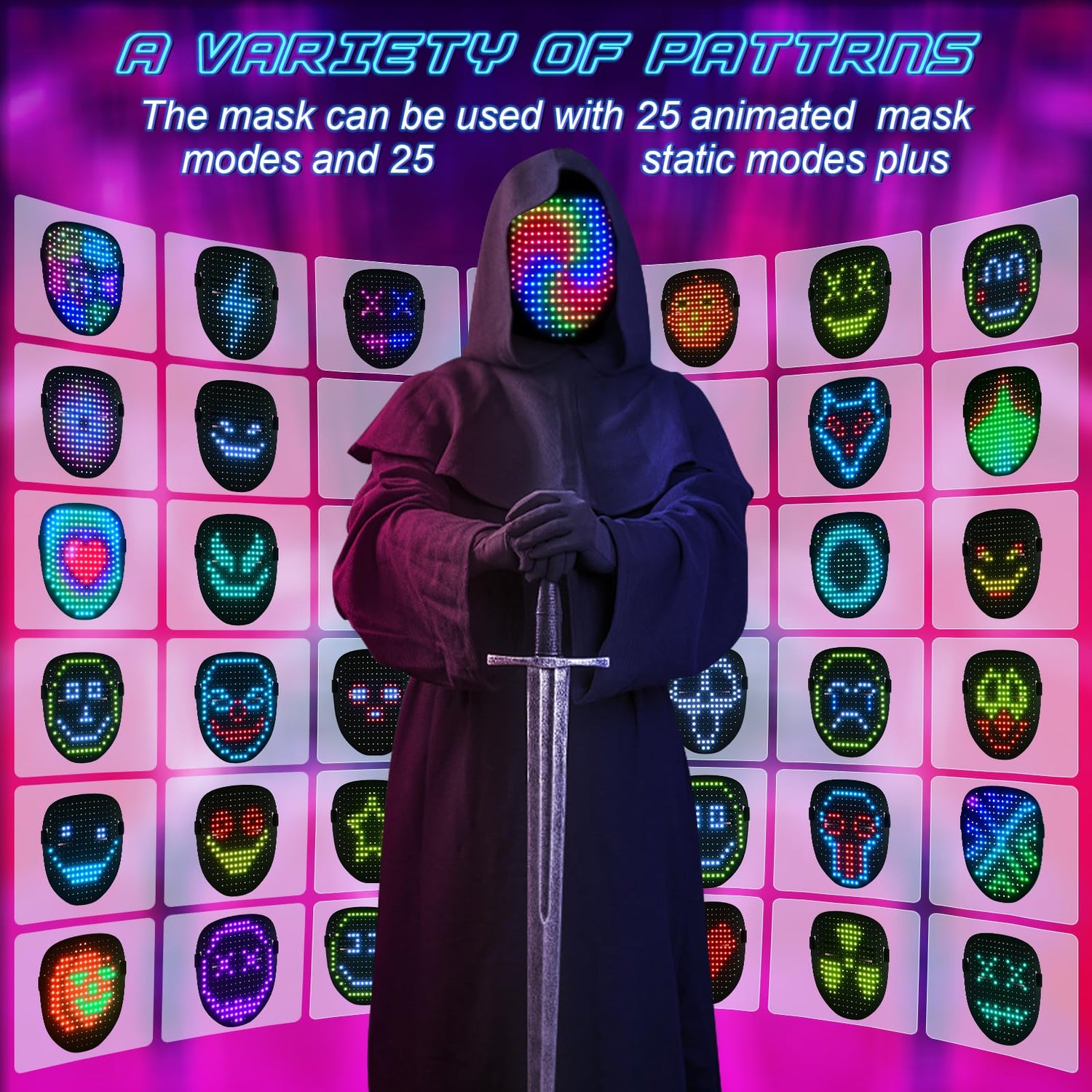 - [Led Mask Designs for Epic Transformations] Dominate parties with this Led mask for Halloween, 25 graphics + 25 animations featuring 234 high-brightness Led beads create instant mask cool moments. From spooky glowing eyes to rave-ready patterns, this light up mask works for Halloween cosplay. Experience stunning clarity and vibrant light displays.