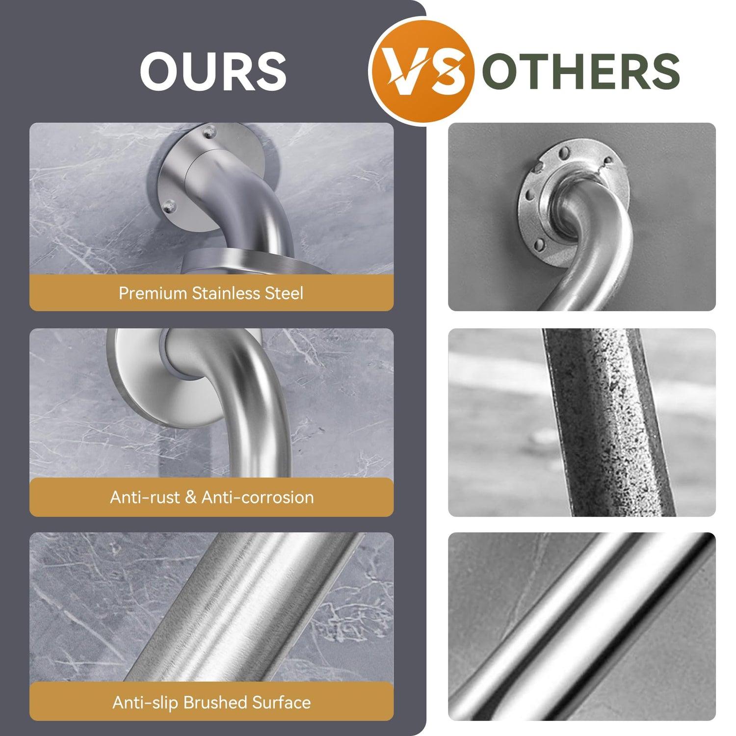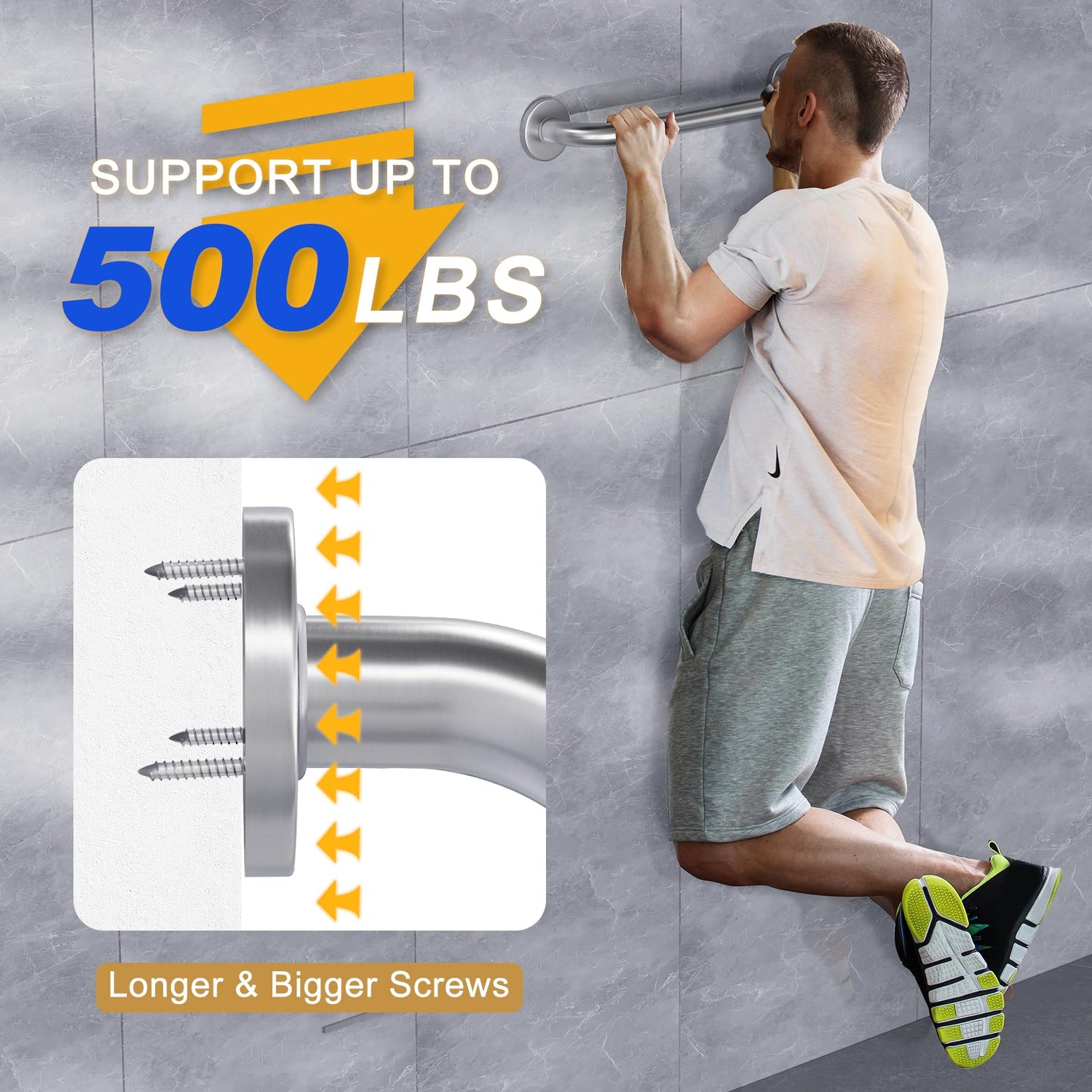 - SAFE AND SECURE - Longer and bigger screws, enlarged base and thickened tube, our bathroom shower grab bar is easy to grip, supports up to 500 lbs, keeps you and your loved ones safe and secure.