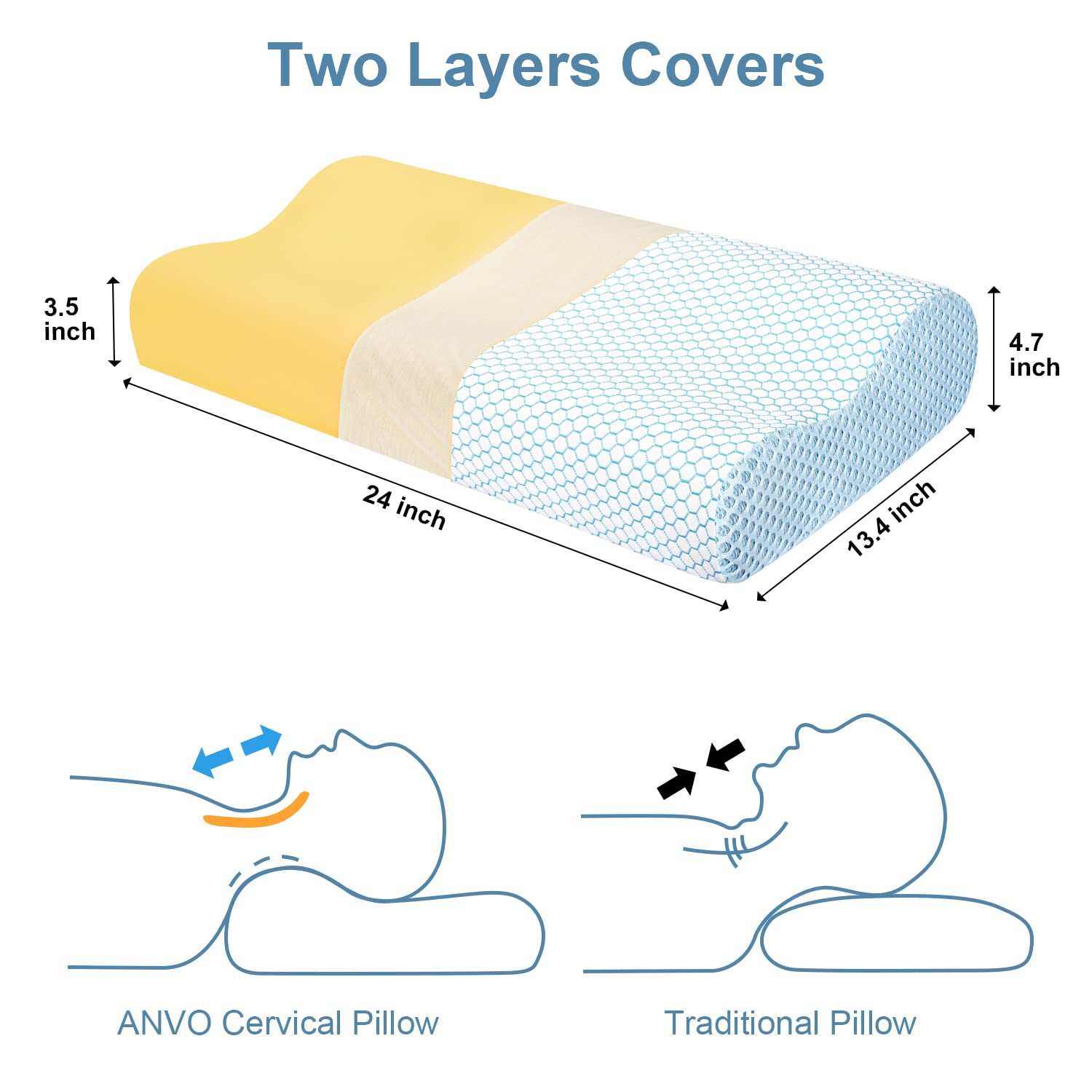 - šć2 Personalized Height in A pillow for Any Sleep Styleć: Anvo contour cervical pillow with size 24*13.4*3.5/4.7 inch ( L x W x H) has two neck support levels to support your neck naturally which provide customize fit for side, back, or stomach sleeper. Snooze away and neck aches away in the morning
