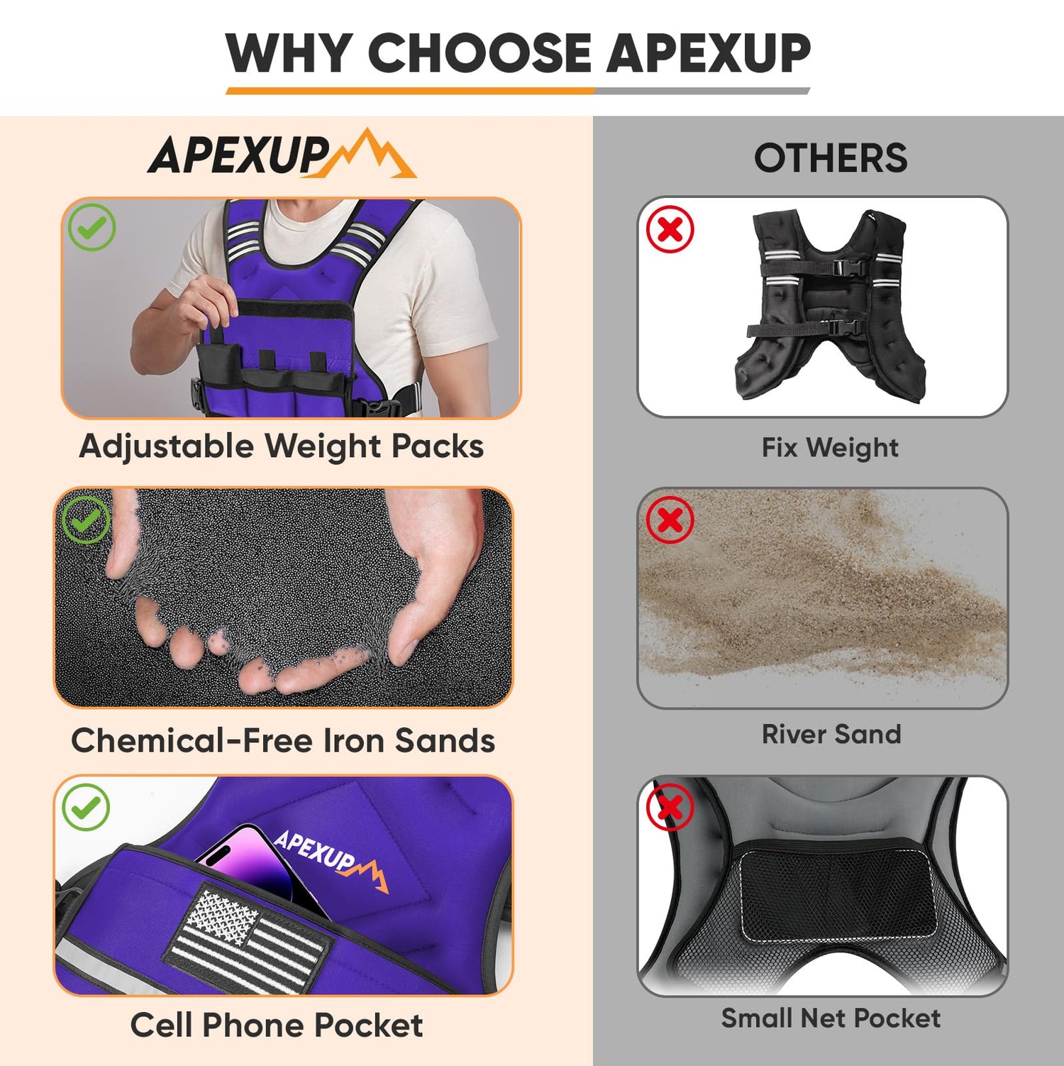 - [ADJUSTABLE WEIGHTED VEST] APEXUP adjustable weighted vest has a base self-weight and comes with 6 sandbags, allowing you to adjust the weight according to your needs and saving you the trouble of buying multiple vests. Choose from 3 weight ranges based on your training stage, 4-10 pounds, 12-18 pounds, and 20-32 pounds