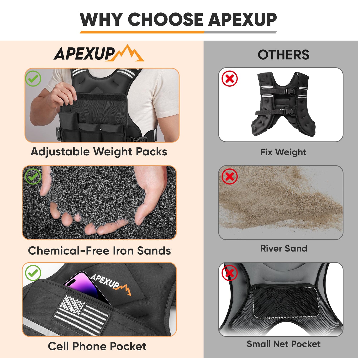 - [ADJUSTABLE WEIGHTED VEST] APEXUP adjustable weighted vest has a base self-weight and comes with 6 sandbags, allowing you to adjust the weight according to your needs and saving you the trouble of buying multiple vests. Choose from 3 weight ranges based on your training stage, 4-10 pounds, 12-18 pounds, and 20-32 pounds.