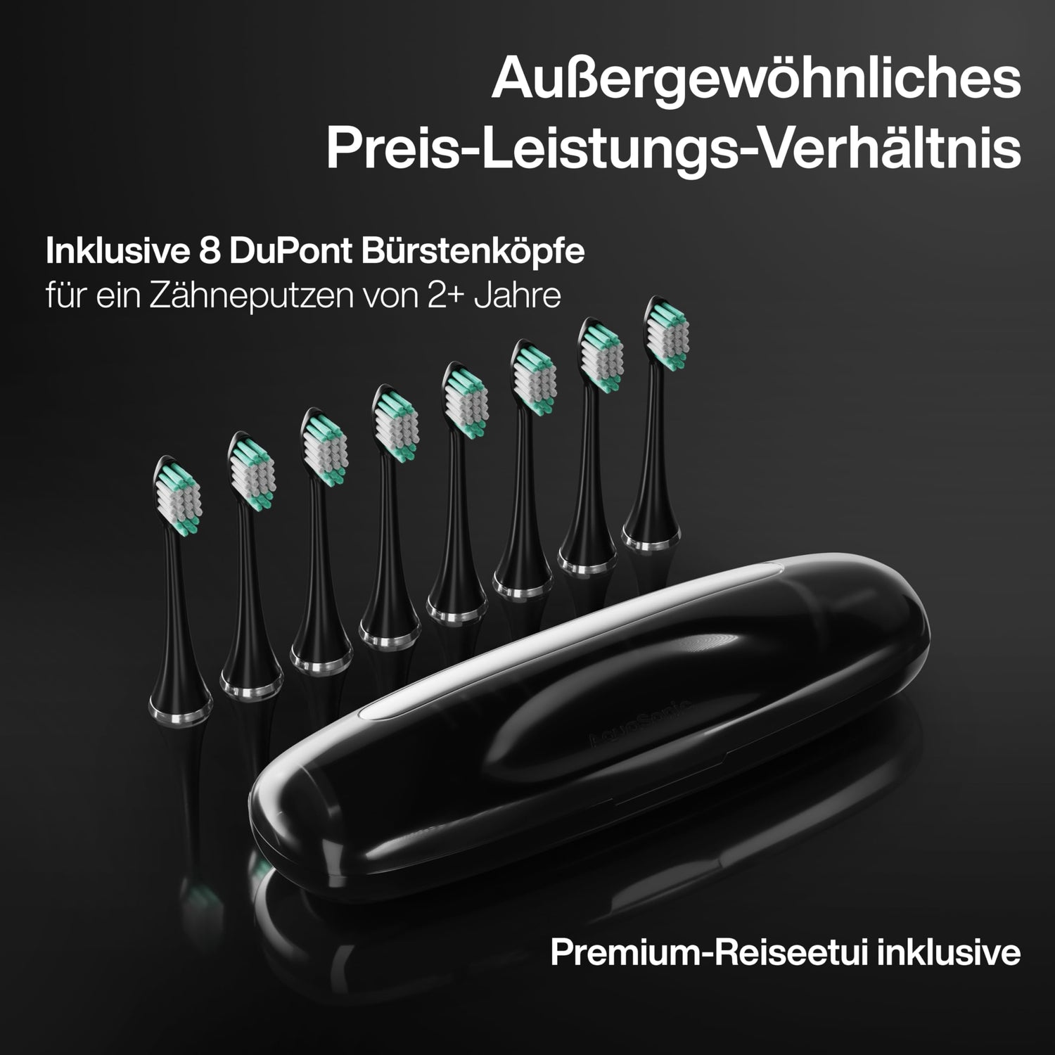 - What's in the Box - 1 AquaSonic Black Series Smart Toothbrush, 1 wireless charging base, 8 DuPont brush heads, 1 travel case, warranty card, and user manual.