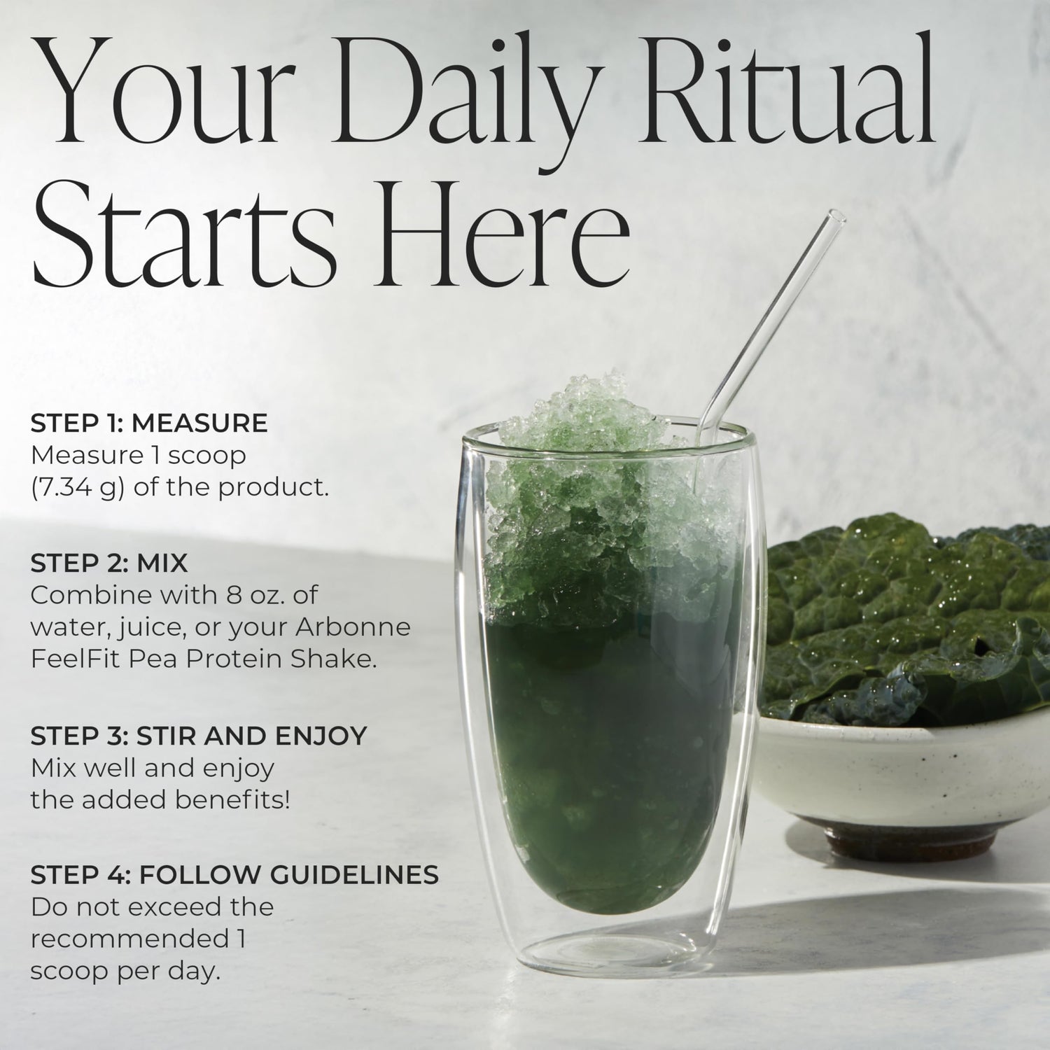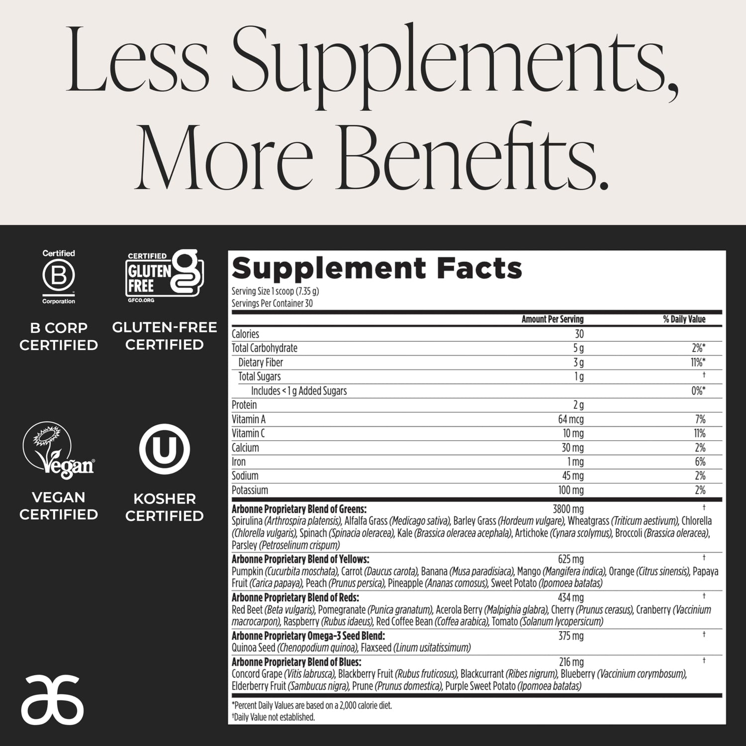 Details: Arbonne BeWell Superfood Greens Powder - Health Supplement Powder Made from a Variety of Fruits and Vegetables, Organic Green Juice Supplement, 7.8 oz Fruits and vegetables are important foods to include in your daily meal planning. When you find it challenging to regularly consume these foods, a nutrition supplement can help increase your intake. One scoop of this versatile, vegan superfood powder delivers a blend of 36 fruits and vegetables in each serving for a boost of organic greens. Featuring prebiotic fiber and phytonutrients along with a deep-green color courtesy of Blue-Green Algae derived from Spirulina, Chlorella, Wheatgrass and Barley Grass, this vegan nutrition supplement provides the benefits of eating the full color spectrum of fruits and vegetables. Sweetened with cane sugar and stevia, our organic green powder can be added to water, juice or a green smoothie, making it easy to get the greens your body needs. As a vegetable powder supplement, this superfood blend goes beyond just greens. It combines the health-boosting power of leafy vegetables with vibrant, nutrient-dense fruits such as pomegranate, mango, and blueberry. This green drink powder is specifically designed to support digestive health, balance the microbiome, and help fuel your day. With a blend of 36 fruits and vegetables, this power greens powder provides a comprehensive boost of essential nutrients to support overall health and wellness. With ingredients like green spirulina powder, chlorella, and nutrient-dense grasses, this green smoothie powder offers an easy way to enjoy the health benefits of the full color spectrum of fruits and vegetables in one serving. Formulated without artificial colors, flavors or sweeteners; formulated without high fructose corn syrup, dairy or soy. Formulated without gluten. These statements have not been evaluated by the Food and Drug Administration. This product is not intended to diagnose, treat, cure or prevent any disease. Pregnant or breastfeeding women, those with a medical condition, and those taking medication should consult with a healthcare professional before use. Do not use if safety seal is broken or missing. Keep out of reach of children.