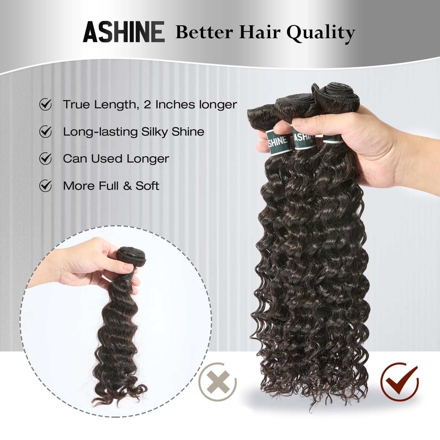 - 【True Length and Quality】ASHINE sets industry standards with its truest length, surpassing other brands by an impressive two inches. Our hair bundles provide an unbeatable level of quality and can be dyed and bleached. With ASHINE, enjoy the luxury of fuller, softer hair that's easy to care for and restyle.