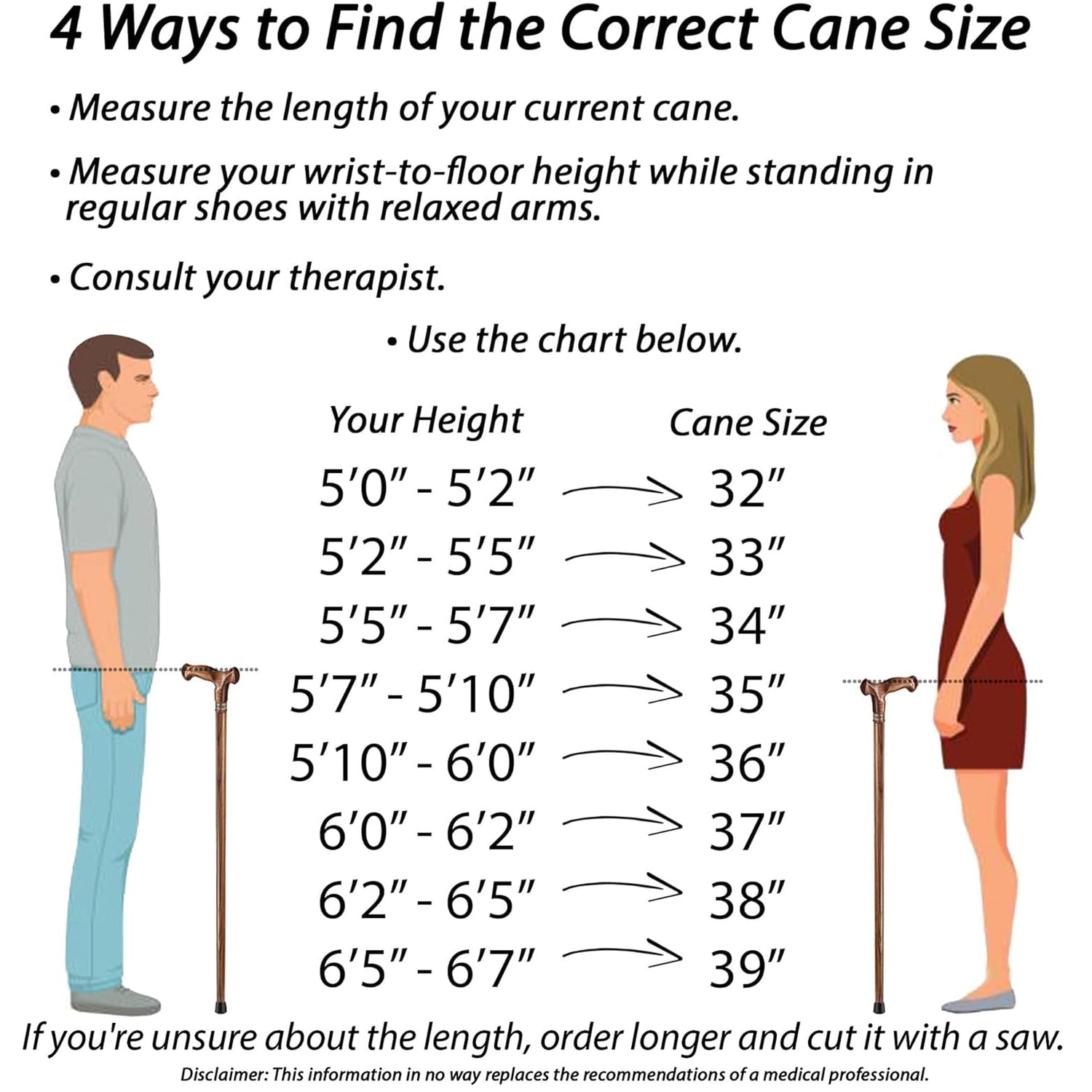 - Choose the Correct Length to Avoid Spine Pain. Asterom Canes are crafted in lengths from 32" to 39", and they are the only canes of solid construction (unlike rattling, unstable folding aluminum canes). Choose the proper cane length according to your height to avoid spine pain caused by incorrect posture.