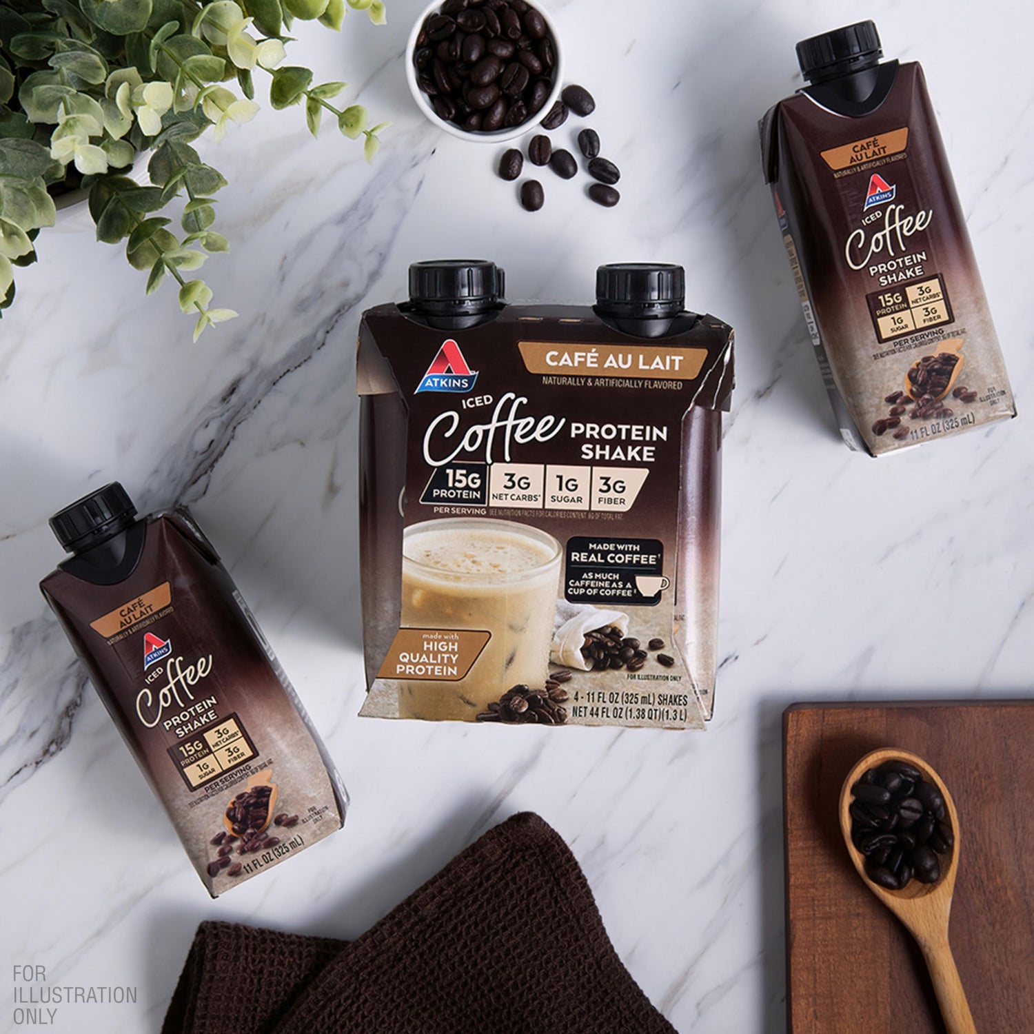 Details: Experience the creamy and classic flavor of Atkins™ Café au Lait Iced Coffee Flavored Protein Shakes. Specially crafted for coffee lovers and low carb lifestyles, these coffee flavored protein shakes blend the smooth taste of café au lait with the energizing caffeine of a cup of coffee. Each high protein shake delivers 15g of protein, 3g net carbs, and 1g of sugar per serving, making it an excellent option for keto-friendly and breakfast protein shake routines. Made to fit your lifestyle, these shakes are gluten free, low glycemic, and contain no artificial growth hormones, so you can feel confident in every sip. With 3g of fiber in every container, they help keep you feeling full and satisfied—perfect for breakfast on the go, a midday snack, or post-workout recovery. If you're looking for a shake that fits easily into your routine w, these protein shakes offer a simple and satisfying way to help support your nutrition goals. Atkins™ Café au Lait Iced Coffee Flavored Protein Shakes offer the convenience, nutrition, and taste you need to stay on track with your low carb lifestyle or keto goals, without sacrificing flavor or indulgence. Per Serving. See Nutrition Facts for Calories Content. 9g of Total Fat. 1g Sugar, including 0g Added sugars per serving. Not a low-calorie food. 6g total carbs, 3g net carbs. Net carbs = total carbs - fiber. Glycemic load of under 10. Product designed to be used with the Atkins ketogenic programs. Instant Coffee. Caffeine content per shake as compared to a standard 8 fl oz cup of brewed coffee. No significant difference has been shown between milk derived from rBST-treated and non rBST-treated cows.