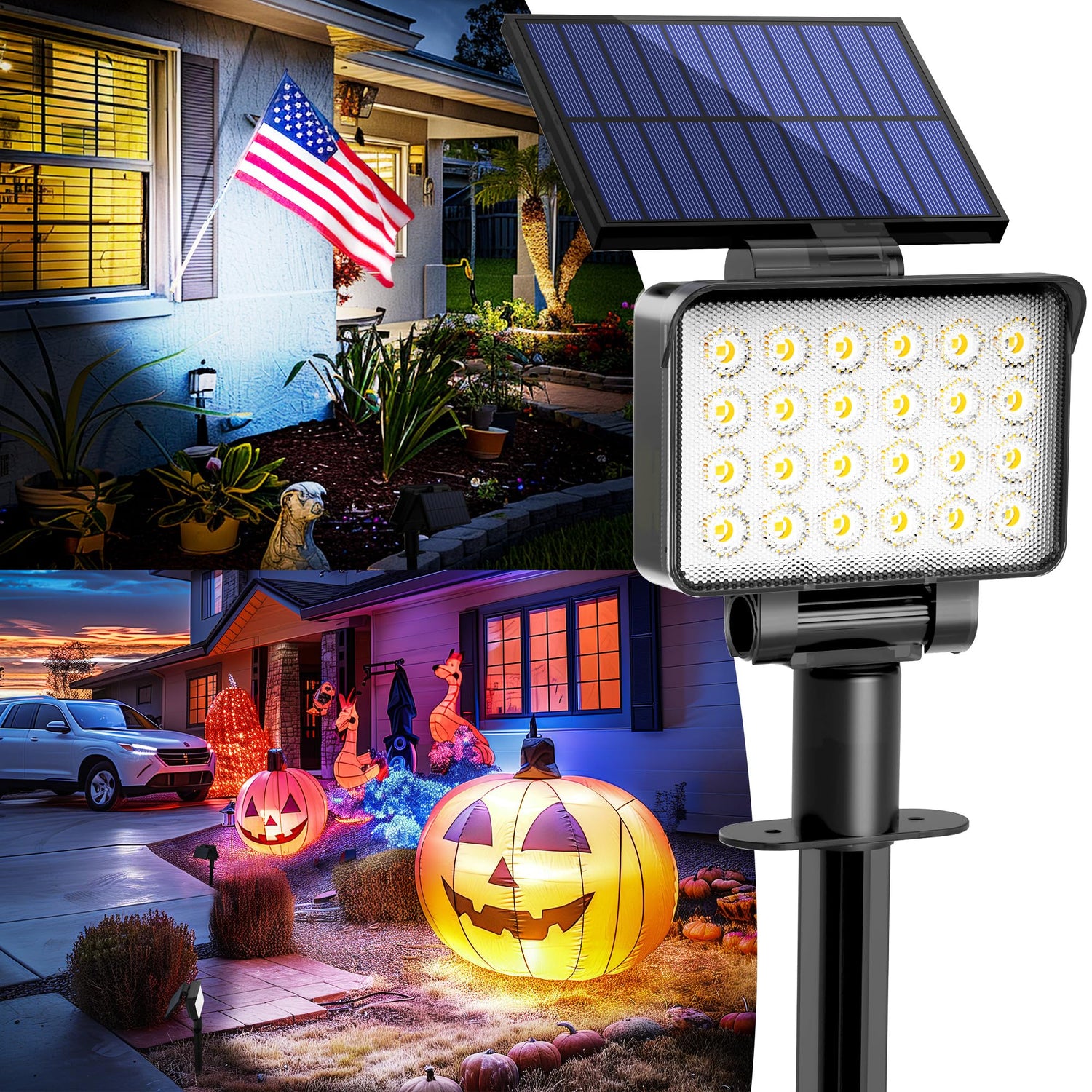 - Perfect for Accent Lighting: Due to their stronger light focusing function, our spotlights are perfect for illuminating decorative flags, large trees, sculptures, and exterior walls. They also provide safety lighting for your garden, front yard, backyard, driveway, and swimming pool. During Holiday, our solar Halloween lights create an exaggerated atmosphere that complements your decorations, adding a touch of mystery to your yard or porch. Similarly, during Christmas, placing solar landscape lights in your yard or garden, along with Christmas trees and decorations, fills the space with festive atmosphere, bringing joy to your family and neighbors