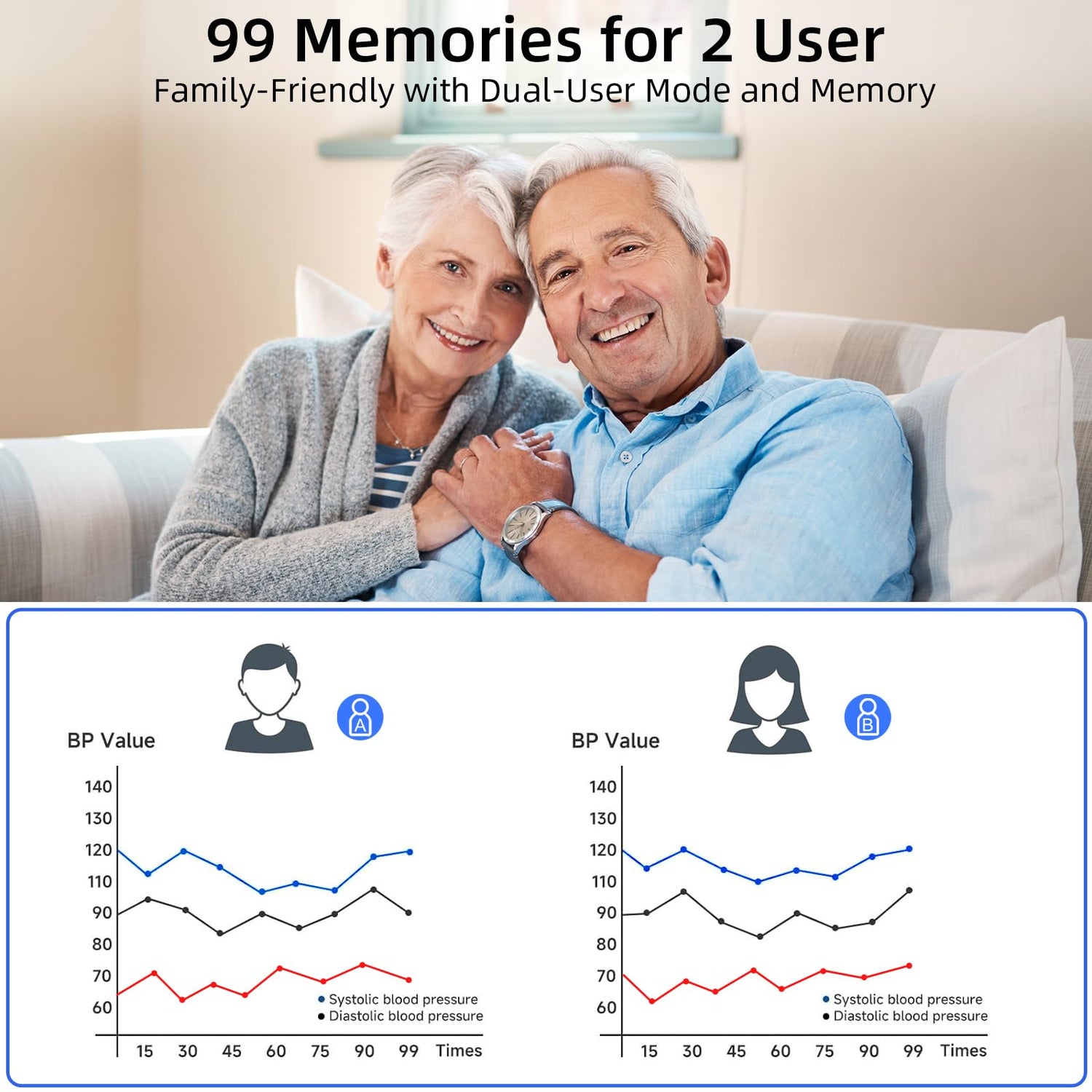 - Tailored for Parents for Better: Ideal for families and couples, our digital blood pressure monitor accommodates two users with a generous 99 sets of blood pressure memory each, totaling a whopping 198 sets. you can monitor and track your blood pressure changes effectively to keep track of your family's health effortlessly