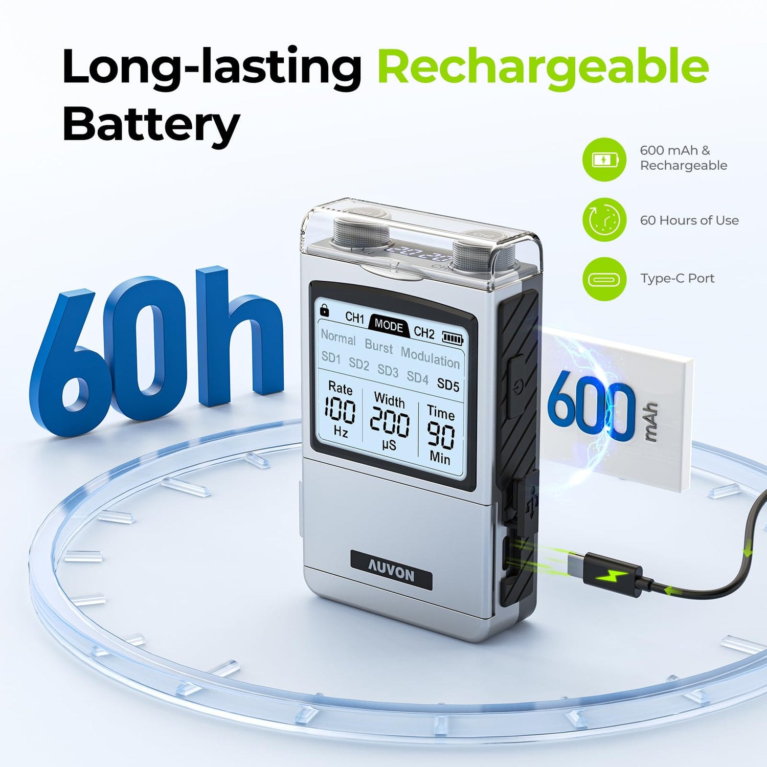 - Rechargeable and Powerful Battery for 60h Usage: The TENS machine for pain management is upgraded with a powerful 600 mAh battery for 60 hours of continuous therapy. Included a Type-C cable (no adapter), this electric massager for muscles can be connected to a wall charger, power bank, or laptop USB port for charging. 4 simple buttons make operation more intuitive, and the flip cover can prevent accidental contact