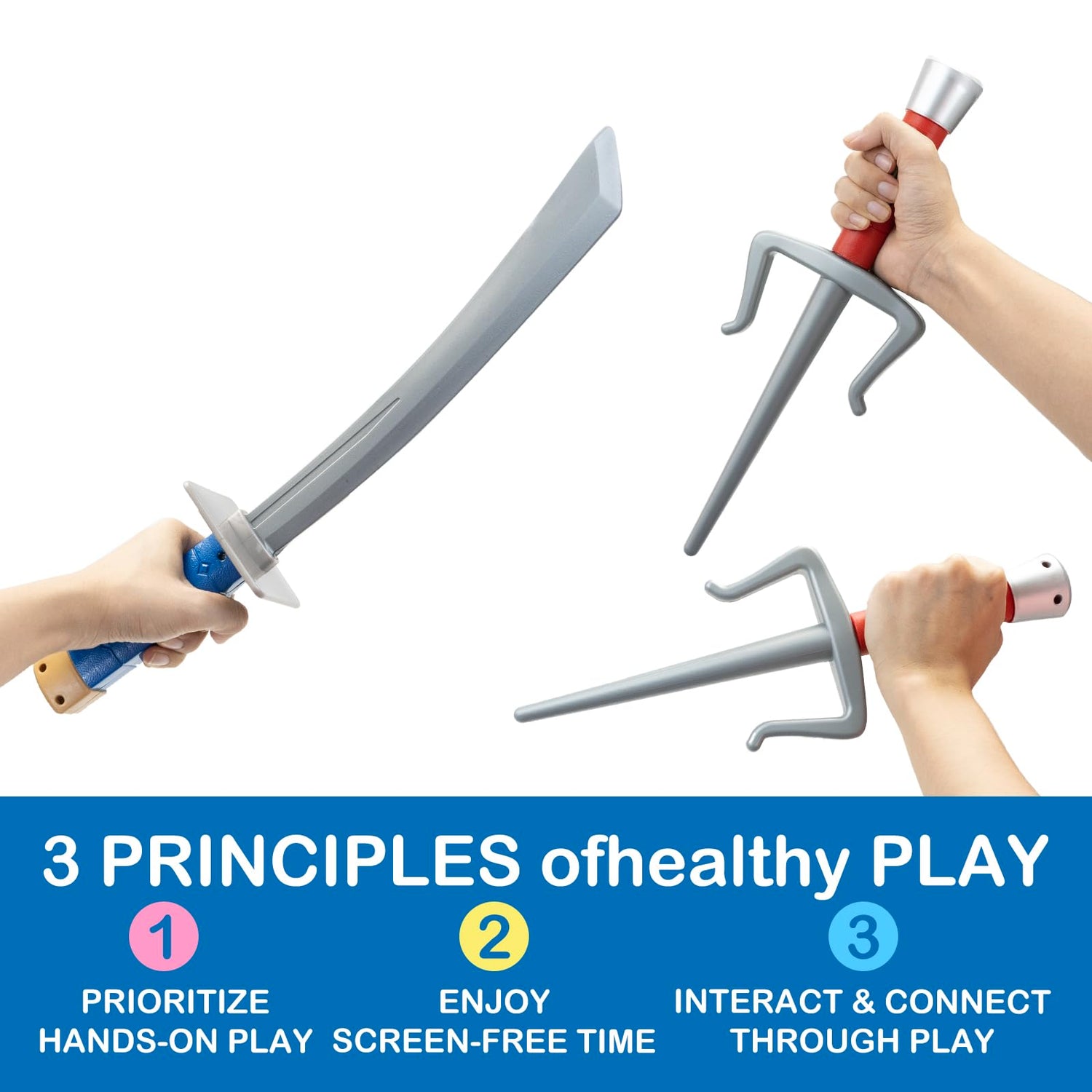 - [Quality materials and attention to detail] The set comes with: Turtle Shell *1 fork *2 knives *1 nunchakus *1 telescopic stick *1 color blindfold *4 Frisbee *2, Turtle Hero is so neat that even a family can be immersed in it. These costumes are made of high-quality plastic materials. They are durable and lightweight, comfortable and easy to wear, safe and fun to play with.