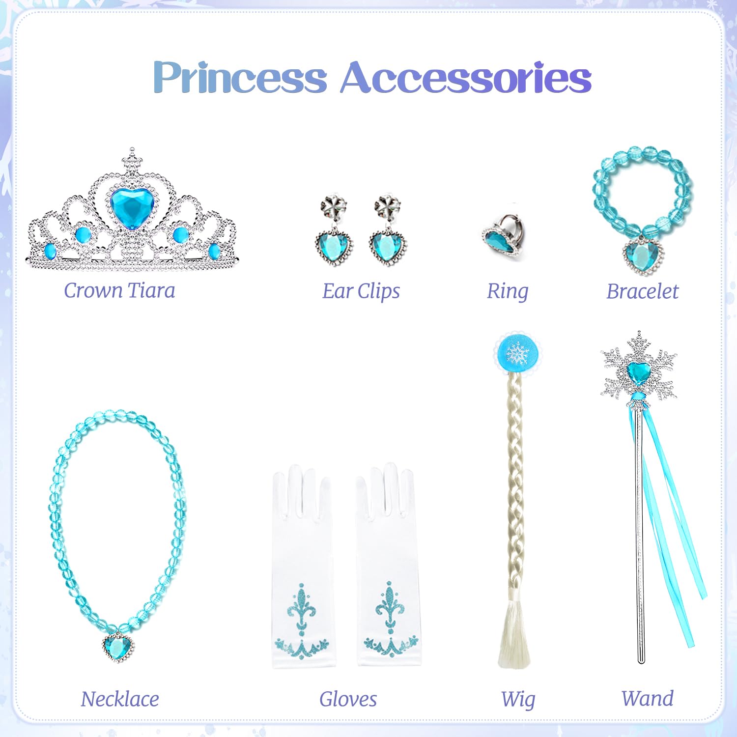 - Elsa Dress Set: Includes crown, gloves, braided wig, magic wand, ring, ear clips, necklace and bracelet. Each accessory has been carefully designed to recreate a classic image from the movie, so your kids will feel like they're in a white snowy wonderland