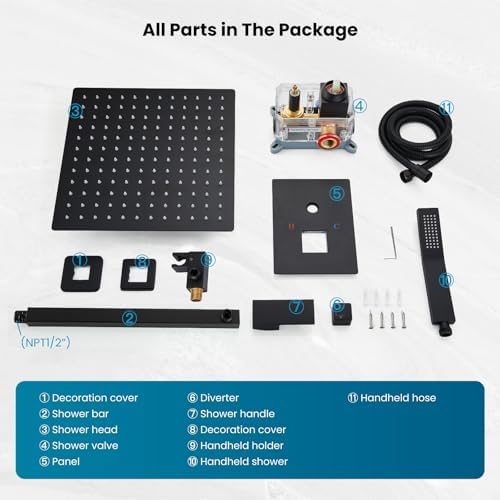 - 【Include】:10 inch Square rain shower head, handheld shower spray,59 inch shower hose,13.7 inch shower arm,handheld holder, pressure balance valve,panel,handle,cover and install hardware include.