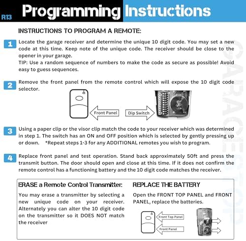 - High quality 10 dip switch garage door opener remote replacement. The transmitter is a 10 pin gate opener remote that will only activate receivers set with the same code. Use a random sequence of numbers for your linear garage door remote replacement, to make your 10 digit remote control gate opener code as secure as possible.
