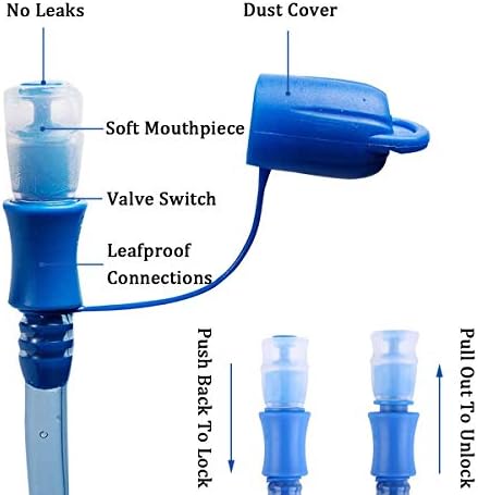 - UPGARDE LEAK PROOF:Soft yet durable mouthpiece with easily accessible ON/OFF valve prevents leakage.You can control the water flow by biting, First pull up on the drinking cap, gently bite the mouthpiece with your front teeth to have a sip and start drinking, push back to stop water flow. Quick-release tube is detachable. Auto shut off while the tube is removed, the hydration bladder will stay filled non-leaking. The water storage reservoir also has a dust cover to keep dirt out.