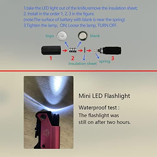 - How to use the LED light:Take the light out of the knife and unscrew it.Take away the black insulation sheet between the spring and the batteries,then screw it back(Note:If you need to reinstall or replace the batteries, make sure that the blank side of the batteries are facing the spring,and you have to press the spring when screw it.).The light can turn on when tightened.If you want to turn off the light, just loosen it.You can refer to the picture and video instructions.