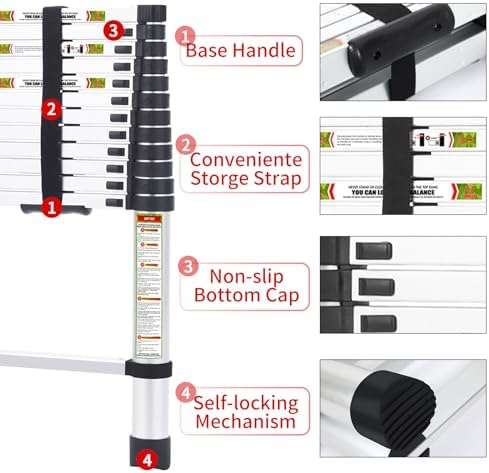 - ✔【Independent Locking Mechanism】:For safety, we purposely designed each section with independent locking mechanism to fix and adjust the extension ladder, effectively preventing accidental contraction and more personalized needs to adjust the height of telescoping ladder.