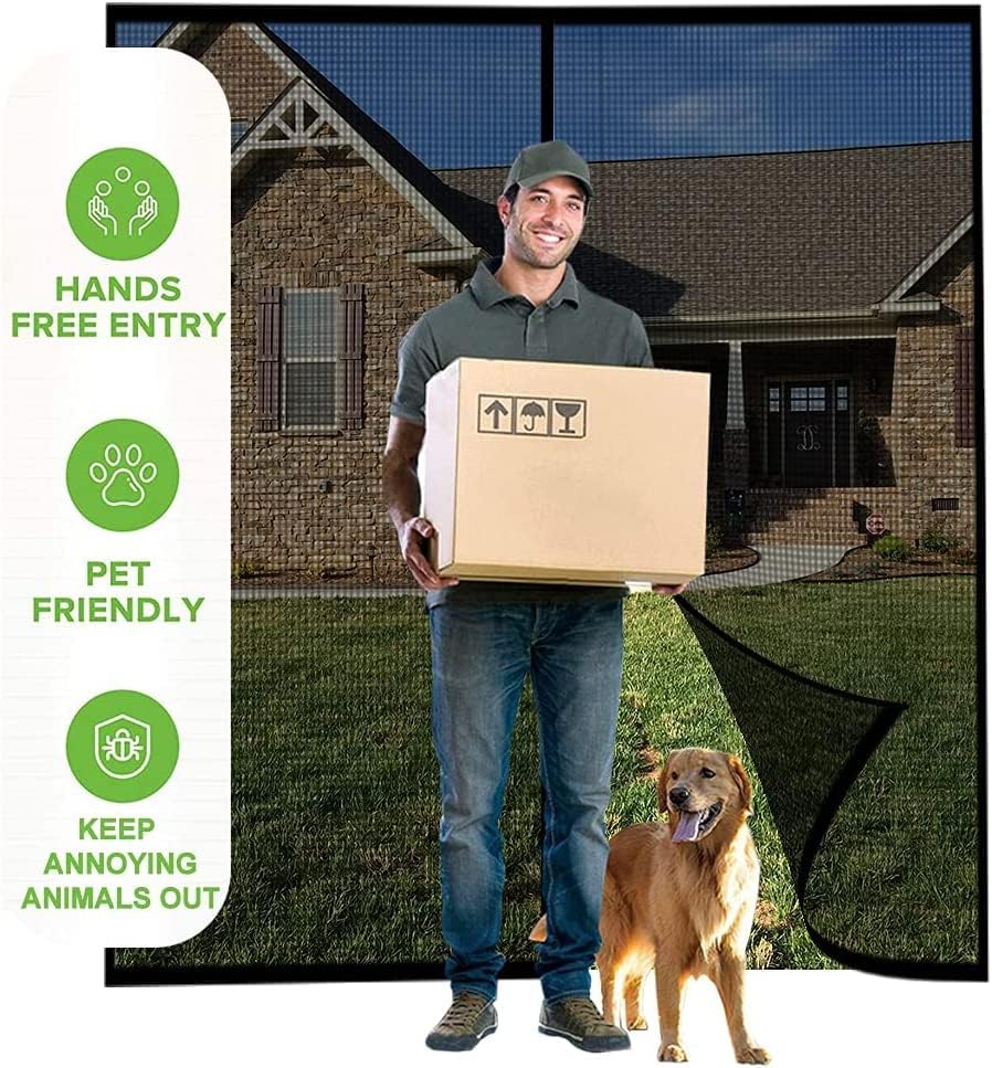 - UNIQUE DESIGN: Strong magnetic and extra gravity sticks closure, directly walkthrough screen doors no matter for humans or pets. Extra 20 gravity sticks were added to the bottom sides, which helps with wind resistance. And the strapping tapes at the top allow you to roll up the screen and secure it to the top