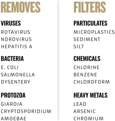 - REMOVES ALL PATHOGENS. 99.9% of viruses (e.g. rotavirus, norovirus, hepatitis A), 99.9999% of bacteria (e.g. E. Coli, salmonella, dysentery), and 99.9% of protozoan cysts (e.g. giardia, cryptosporidium, amoebae)