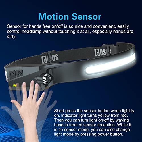 - Motion Detection Technology, Hand-Free Light: Save tons of extra battery. COSOOS wide angle headlamp has built-in 1200 mAh lithium battery and please charge it by included usb c charging cable before use. Choose 1 of brightness settings, short press sensor button and set it as motion detection (Indicator light turns yellow from red.) Then you can turn light on/off by waving hand in front of sensor reception
