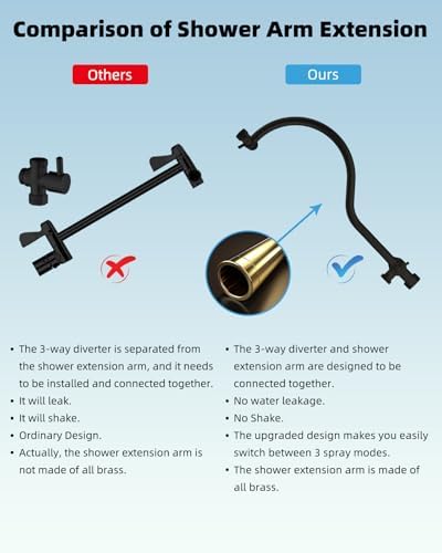 - Upgraded 3-Way Diverter Valve & Easy Installation: This shower head combo is easy to install without tools or plumbers. The 3-way diverter can be used with a shower head/rainfall shower head alone, or with two showers at the same time. Our 3-way diverter and shower extension arm are designed to be connected together without leaking and shaking, while ordinary 3-way diverter is separated from extension arm, and it needs to be installed and connected together, which will lead to leak and shake