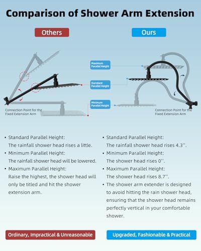 - Upgrade Adjustable 12'' Shower Extension Arm: The height and angle adjustable curved shower head arm extension fits any rain shower head or handheld shower head. The height can be adjusted up and down, ensuring the shower head is always vertical in your large size and will not hit the shower arm, instead of sloping water like ordinary straight shower arm. The curved shape design enhances its bearing capacity, elevating your shower head and enabling vertical water flow