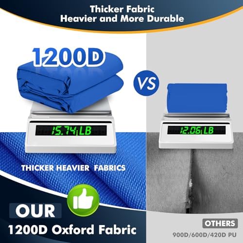 - Heavy Duty Ripstop Materia: Made of Thickened 10.2 oz 1200D Marine Grade Polyester(more durable than 900D/600D/420D/300D/210D fabric). Mixed with Upgraded Anti-UV Composite prevents the cover from ageing, disintegration and tearing caused by exposure to the sun. Backside 3-Layer PU Coating which can withstand up to 6000+ pa water pressure. All seams are covered with waterproof sealing tape to prevent water seepage.