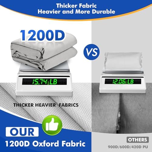 - Heavy Duty Ripstop Materia: Made of Thickened 10.2 oz 1200D Marine Grade Polyester(more durable than 900D/600D/420D/300D/210D fabric). Mixed with Upgraded Anti-UV Composite prevents the cover from ageing, disintegration and tearing caused by exposure to the sun. Backside 3-Layer PU Coating which can withstand up to 6000+ pa water pressure. All seams are covered with waterproof sealing tape to prevent water seepage.