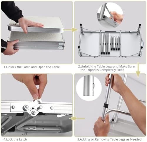 - High Quality Material, Sturdy and Durable: The entire frame of portable table is made of thicker aluminum alloy, which is very solid and durable. MDF (Medium Density Fiberboard) tabletop is smooth and easy to clean. You can easily remove stains by simply wiping with a damp paper towel