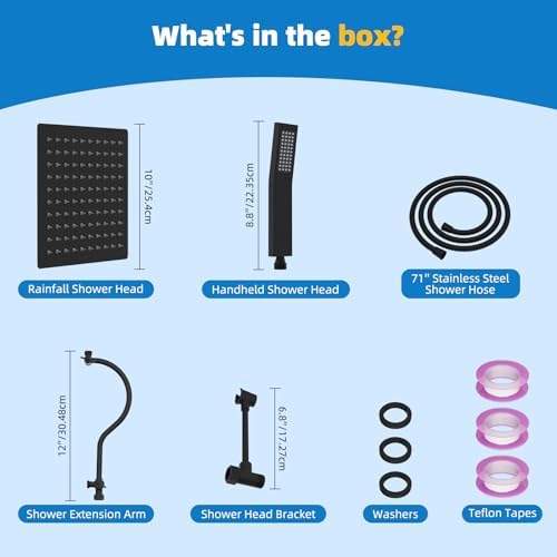 - Shower Head Combo: Hibbent shower combination comes with a 10x9'' rain shower head, handheld shower head, 71'' hose, 12'' extension arm, shower head bracket, washers, Teflon tape, and installation manual. Stainless steel and brass extra-long 71'' shower hose is made of odorless EPDM material that can be used in a high-temperature environment. The brass swivel ball connector makes it easy to adjust the shower head to any angle you want, giving you a luxurious, hotel-style bathing experience