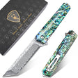 AUBEY Damascus Pocket Knife with Clip, Sharp Tanto Blade with VG10 Core Folding Knife with Abalone Shell Handle and Glass Breaker, EDC Camping Knife for Gift Survival Collection