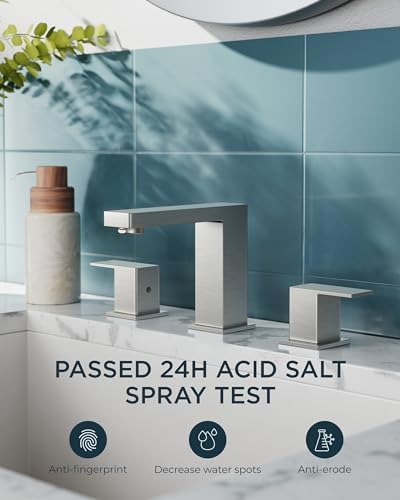 - ERGONOMIC CONTROL: 8 inch bathroom faucet rotates smoothly with minimal torque. Ambidextrous design suits your usage habits and fits most 3-hole sinks (6" -12" adjustable width). The vanity faucet passes 24hr ASTM B117 test - cleans with a light wipe