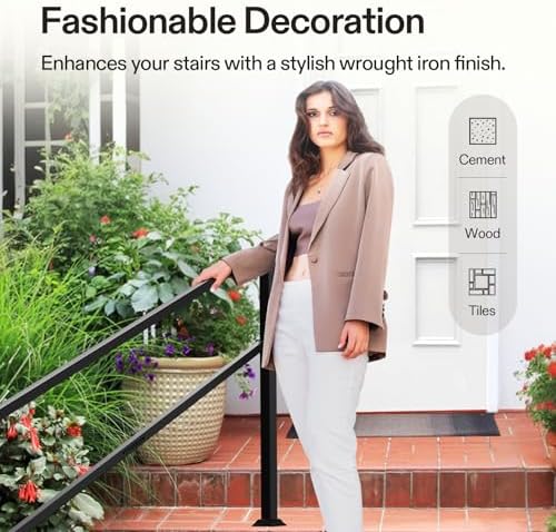 - Safe & Fashionable: This railing’s powder coated surface is easy to maintain and clean; It helps people keep balance in rainy days or in winter, and prevents slipping on wet or icy days, and also decorates your stairs with a fashionable wrought iron look