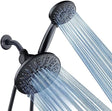 - Each Shower Has 6-Settings: power Rain, Pulsating Massage, Power Mist, Rain Massage, Rain Mist, Water Saving Pause mode. Patented 3-Way Water Diverter: simply turn switch to direct water flow between two showers. Features Anti-Swivel Position Lock Nut for easy & secure connection. Angle-Adjustable Overhead Bracket: lets you point each shower where you want it for hands-free operation at desired angle. Reinforced 5 Ft. Stainless Steel Hose: durable Heavy-duty Design with Brass Connection Nuts.